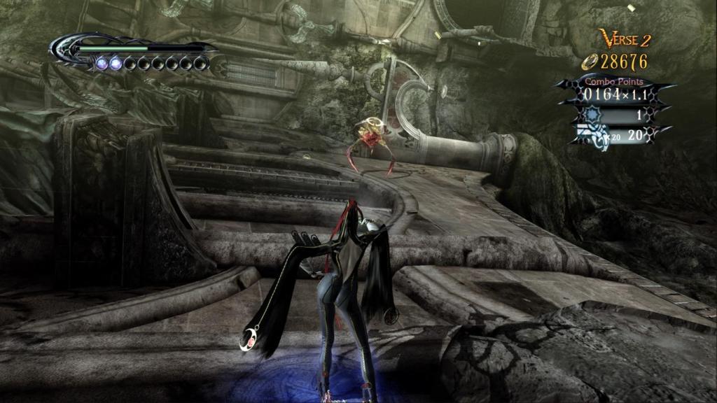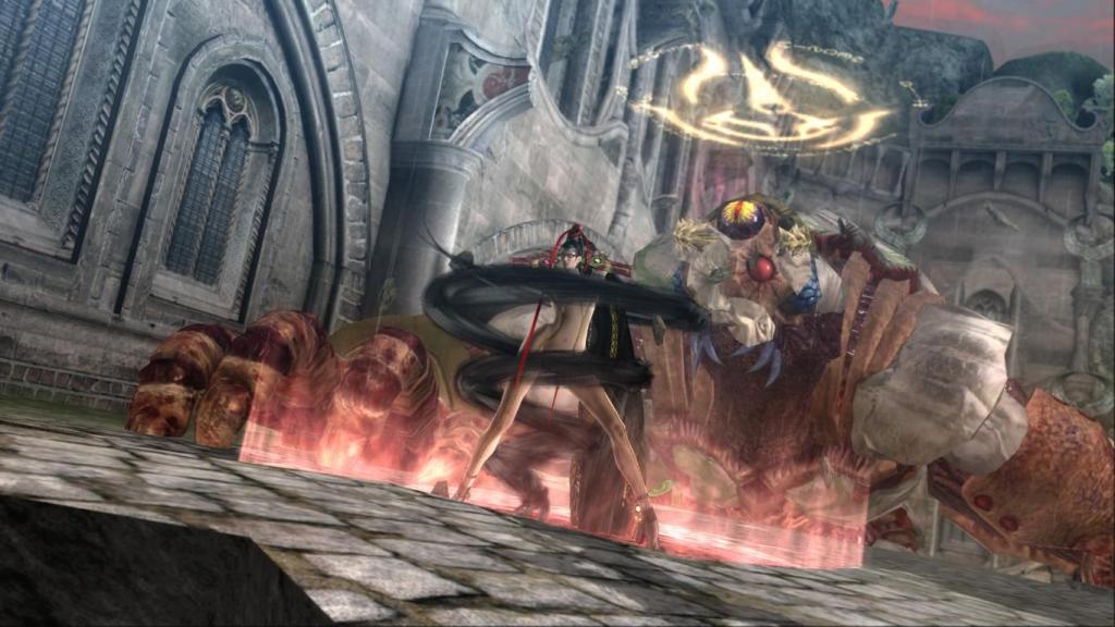 Besonders hervorzuheben muss man beim Spiel, neben dem interessanten Charakter, der stellenweise eine ähnliche Popularität, wie Lara Croft nach dem Erscheinen des ersten Tomb Raider, zu Teil wurde, auf jeden Fall die schnelle Action und das ausgefeilte Kampfsystem. Es handelt sich immerhin um ein Spiel von Platinum Games, die neben der Bayonetta-Reihe auch die Macher von „Nier: Automata“, „Metal Gear Rising: Revengeance“, „Astral Chain“, „Vanquish“ und dem Publikumsliebling „The Wonderful 101“ sind. All diese Spiele überzeugen durch schnelle Action und ausgefeilte Kampfsysteme und da ist selbstverständlich auch „Bayonetta“ keine Ausnahme. Denn Bayonetta hat in ihrem Repertoire nicht nur Schläge, Tritte und Angriffe mit den Waffen, sondern auch unzählige Kombinationsmöglichkeiten und Spezialangriffe, die von ihrer Komplexität und dem Variantenreichtum gut und gerne mit Kampfspielen verglichen werden können. Besonders cool sind dabei Situationen, wenn man beispielsweise bei gedrehter Ansicht an der Fassade eines viktorianischen Schlosses kämpft, oder ein perfekt getimter Ausweichsprung die Zeit verlangsamt und man dann eine ganze Truppe grotesker Erzengel mit einem mächtigen Finisher den Gar ausmacht. Oder einfach, wenn haushohe Gegner in bester God of War-Manier ganze Häuser (samt uns) durch die Gegend werfen. Hier merkt man deutlich die Erfahrung von Hideki Kamiya, der zuvor bei Capcom „Devil May Cry“ produziert hatte, bevor er Platinum Games mitbegrundete und unter anderem „Bayonetta“ schuf.