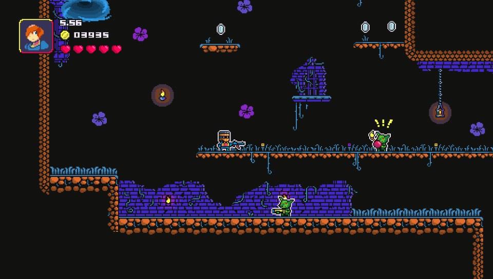 Insgesamt gibt es 26 unterschiedliche Levels zu bewältigen, die sich zwar von den verwendeten Versatzstücken recht ähnlich sind, aber dennoch alle paar Levels mit wechselnden Mechaniken, wie selbst-scrollenden Sägeblättern am unteren Bildschirmrand auf Trapp halten. Zwar hat man nach kurzer Zeit alles Variationen gesehen, aber die Levels an sich sind kurzweilig genug, dass es dennoch spaßig bleibt. Prinzipiell könnte man dabei durch die Levels durchhetzen, ohne Schätze einzusammeln und Gegner aus dem Weg zu räumen, doch dabei kommt wiederrum der Fokus auf das Loot zum Tragen, das immer wieder zum intensiveren Erkunden der Levels animiert, damit man doch noch mehr einsammeln kann. Lediglich was die Gegner angeht macht sich nach kurzer Zeit leichte Eintönigkeit breit, denn es gibt nur eine Handvoll Gegnertypen, die immer in den gleichen Pattern angreifen und alle mit wenigen Schüssen besiegt sind. Gerade im Vergleich zu „Devious Dungeon“, wo wir nicht nur drei bis vierfache an Levels bekommen haben, sondern auch mit einer Fülle an unterschiedlichen Gegnertypen konfrontiert wurden, die das Spielgeschehen regelmäßig wieder aufgefrischt haben, fällt das Spiel auch in diesem Bezug immens ab.