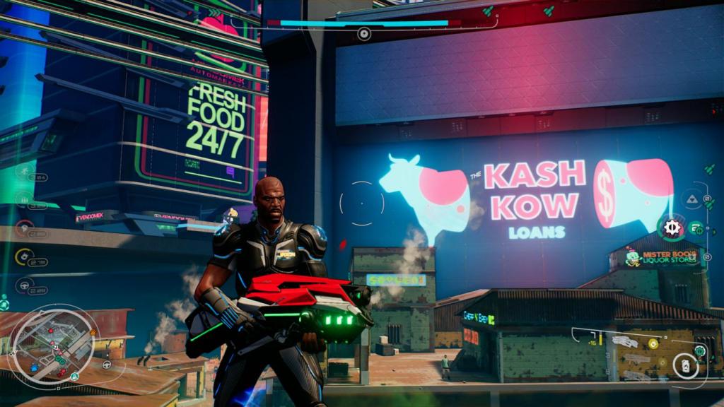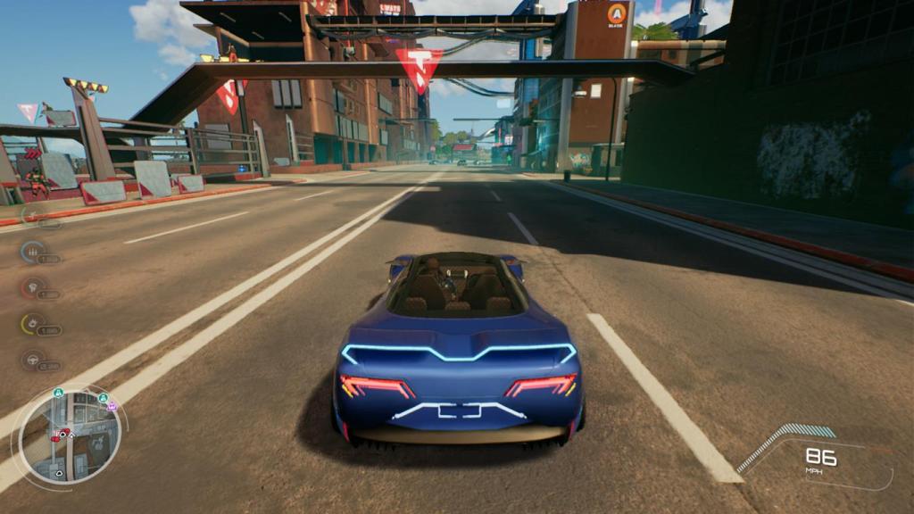 Ein besonderer Twist ist dabei, ähnlich wie bei „Saints Row IV“ die Implementierung von Superkräften, die hier allerdings durch einen besonderen Kampfanzug legitimiert werden. So stehen uns am Anfang zwar nur wenige Fähigkeiten zur Verfügung, doch mit fortschreitendem Spiel, durch das Ausschalten von Gegnern und das Einsammeln von in der Spielwelt versteckten Upgrade-Orbs schalten wir immer mehr Spielereihen unseres Equipments frei und werden in Windeseile zum akrobatischen Supercop. So beherrscht Jaxon irgendwann den Schubdüsen-gestützten Mehrfachsprung, Dash und kann sich in bester Superhelden-Manier durch die Spielwelt bewegen, was die Fahrzeuge in der Spielwelt schon nach dem ersten Drittel des Spiels im Grunde überflüssig macht. Im Vergleich ist die Fahrphysik und Geschwindigkeit dann einfach zu langsam, zumal es mir öfters passiert ist, dass ich zu schnell um eine Ecke gefahren bin und mein Auto danach, ohne Möglichkeit weiterzufahren, auf dem Dach gelandet ist.