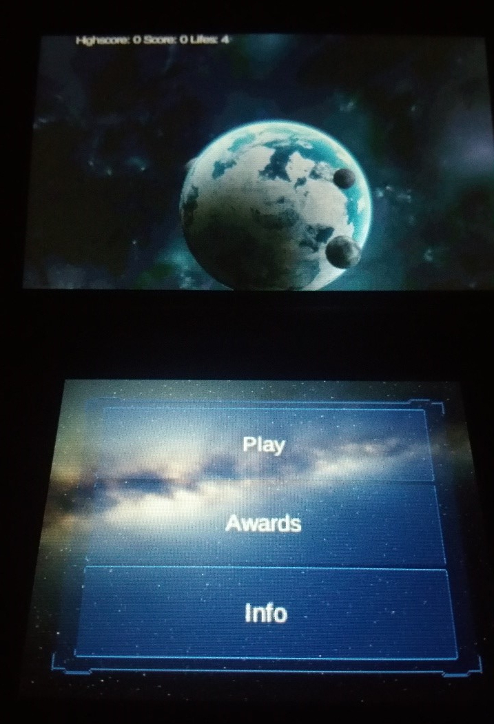 Nach dem Start begrüßt uns der obere Screen mit dem, man muss sagen, ganz hübsch anzusehenden Weltraumhintergrund, wie er auch fortwährend im Spiel zu sehen ist. Im unteren Bildschirm sehen wir das Auswahlmenü. Neben den verschiedenen Spielmodi haben wir noch die Wahl zwischen Awards und Info. Das Ganze wirkt durch das Fehlen jeglicher Sounds und Musik leider etwas, nun ja, trist. Kleiner Tipp am Rande: Der Titel des Spiels wäre doch auf dem Titelbildschirm eigentlich eine gute Idee?