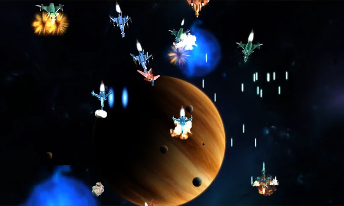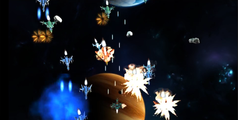 Ja Leuts, das war es. Im Grunde sucht man sich nur aus, ob die Gegner in Reih und Glied heruntermarschieren oder quasi aus allen Wolken fallen. Mehr an Abwechslung ist dann leider auch nicht. Eurer Schuss bleibt immer der gleiche und upgradet sich nach einer gewissen Anzahl der Abschüsse zum Zweifachschuss und Dreifachschuss. Gegnerische Raumschiffe schießen zusätzlich mit Laser und Raketen, warum es diese Upgrades dann nicht für das eigene Raumschiff gibt, erschließt sich nicht. Außerdem gibt es noch kleine Hindernisse in Form von Asteroiden, die bei ordentlichem Beschuß explodieren.