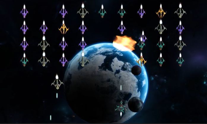 - In „Space Shuttle“ bilden die Gegner oben keine festen Reihen sondern kommen in verschiedenen Bewegungsmustern angeflogen. Oft in einer Geschwindigkeit, dass es so aussieht als fallen sie vom Himmel.