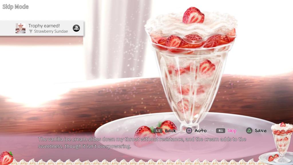 Insgesamt unterhält das Spiel wirklich ungemein und zieht uns als Spieler auch gut in seinen Bann. Die unterschiedlichen Enden motivieren auch abseits der Trophäen herauszufinden, welche unterschiedlichen Verläufe es im Spiel gibt und es gibt durchaus ein paar interessante Wendungen, die man so auf keinen Fall kommen sieht. Einzig die merkwürdige Faszination mit Essen fand ich etwas befremdlich. Es wird zwar im Rahmen der Geschichte durch die Vorlieben von Licia erklärt, doch dass wir bei jedem neuen Essen dann zusätzlich ein Closeup des Speise bekommen, was auch gleichzeitig für viele Trophäen als Screenshot gewählt wurde, ist schon etwas merkwürdig. Dennoch ist das Spiel auf Grund seines Umfangs und der nicht so verschachtelten, oder gar anzüglichen Narrative anderer Spieler der Gattung durchaus für Neulinge zu empfehlen, die bisher noch keine Berührungspunkte mit dem Genre hatten. Nur auf keinen Fall sollte man das Spiel hungrig spielen…
