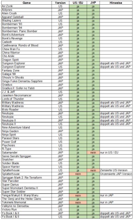 Das Lineup der Originalkonsole richtete sich schon damals an eine spezielle Zielgruppe. So findet man im Katalog vermehrt Shooter und Arcade-Games, die damals ähnlich wie das Neo Geo versuchten das Gefühl aus der Spielhalle nach Hause zu bringen. Und wenn man das bedenkt, macht die Konsole auch alles richtig. Denn im Grunde findet man auf der Konsole alles, was Rang und Namen hat, auch wenn dem ein oder anderen Spieler die Spieleauswahl etwas zu eintönig sein könnte, denn Shooter dominieren das Lineup ungemein, auch wenn diese inhaltlich sehr unterschiedlich sind. Besonders bei „Gradius“, „Salamander“, „Galaga `88“, oder einem meiner persönlichen Highlights „Dragon Spirit“ kommen Shooter-Freunde mehr als auf ihre Kosten. Doch auch abseits der Shooter findet man einige wirkliche Highlighs der Konsole. Neben Klassikern wie „Splatterhouse“, „Ghouls `n Ghosts“ und „New Adventure Island“ findet man selbstverständlich auch mehrere Spiele mit dem Maskottchen der Konsole unter anderem in „Bonk’s Adventure“ oder „Bonk’s Revenge“, aber auch ein paar überraschend gute Bomberman-Teile mit „Bomberman `93“, „Bomberman `94“ und „Bomberman: Panic Bomber“. Und selbstverständlich darf auch eines der gefragtesten Spiele der Konsole „Castlevania: Rondo of Blood“, das exklusiv in Japan erschienen ist, nicht fehlen, das sogar mit der unangepassten Tonspur daherkommt, wo Neuauflagen über eine Neusynchro verfügten.
