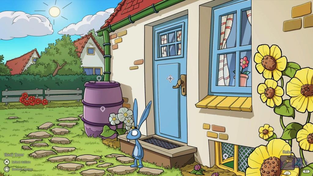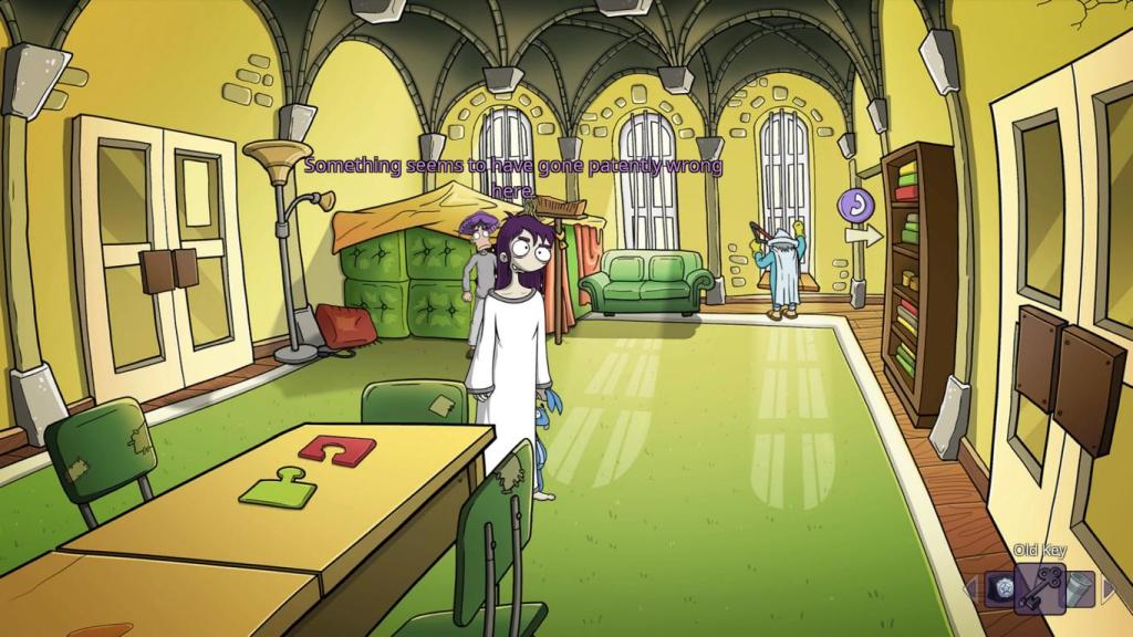 Vom Gameplay her ist „Edna & Harvey: The Breakout“ ein recht klassischer Vertreter des Point and Click-Adventures. Der Bildschirm besteht aus einem Hintergrund und einem Vordergrund. Im Vordergrund steuern wir Edna und Harvey zwischen denen wir in vielen Szenen per D-Pad hin- und herschalten können. Interagieren können wir mit sogenannten Hotspots, was interaktive Elemente von Hinter und Vordergrund sind, interagieren. Auch wenn das Genre vornehmlich auf dem PC mit Maus und Tastatur gespielt wird, hat man es dennoch wirklich gut für eine Steuerung via Controller angepasst. Wir steuern unsere Protagonisten via linken Stick und die Hotspots werden „aktiv“ sobald wir nah genug dran sind. Sind wir gleichzeitig in der Reichweite mehrerer Hotspots können wir mit dem rechten Stick selektieren, welchen wir wollen. Durch das simple Anklicken wird die naheliegendste Aktion (meist „schaue an“) durchgeführt und gedrückt halten öffnet sich ein Kontextmenü in bester SCUMM-Tradition. Weiter gibt es auch ein Inventar, bei dem der aktuell ausgewählte Gegenstand immer rechts unten in der Bildschirmecke angezeigt wird. Dieser ist auch als Vorschlagswert im Kontextmenü, wenn wir mit einem Hotspot interagieren, auch wenn das natürlich nicht überall funktioniert, oder gar Sinn macht. Die Gegenstände im Inventar können entweder per Schultertasten durch gescrollt werden, oder lassen sich klassisch als separates Menü öffnen, was in einigen Fällen auch notwendig ist, wenn wir beispielsweise Gegenstände untereinander kombinieren. Insgesamt hat es damit schon gut geschafft eine klassische Point and Click-Steuerung auf einen Controller zu übertragen, auch wenn ich gestehen muss, dass es etwas Eingewöhnungszeit braucht, bis man sich nicht mehr „verklickt“ und so mitunter den falschen Hotspot selektiert.