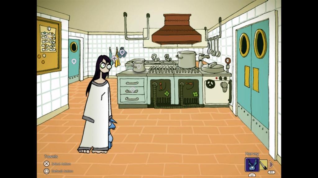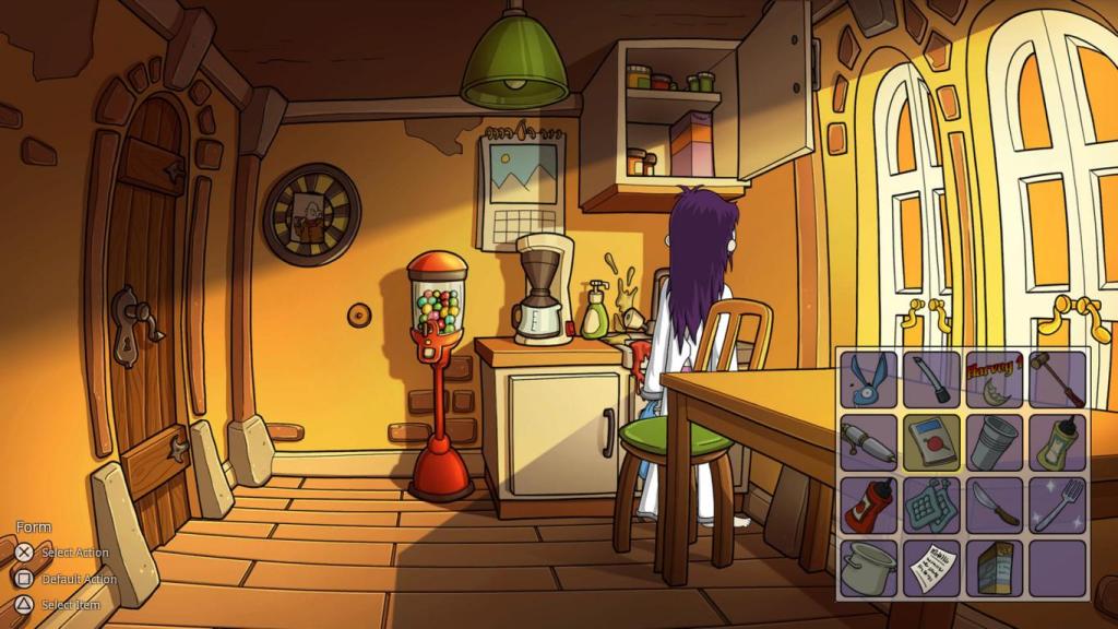 Weiter haben sich die Entwickler auch noch eine kleine Besonderheit in Sachen Gameplay einfallen lassen, was mir schon damals bei der ursprünglichen Veröffentlichung gefallen hat: Die besondere Gameplay-Komponente ist dabei die Unterstützung durch Edna’s Stoffhasen Harvey, der nicht nur mit ihr redet und sarkastische Kommentare fallen lässt, die an stellenweise an Stewie aus „Family Guy“ erinnern, sondern obendrein noch die Kraft besitzt Edna in ausgewählte Szenen ihrer Vergangenheit zu versetzen, wenn es dort etwas zu lernen gibt, das ihr in der Gegenwart hilfreich sein kann. Dabei sind die Rätsel an sich teilweise zwar abstrus, aber im Kontext der Geschichte wiederum logisch und kreativ. So lernen wir früh im Spiel, durch eine dieser „Reisen“, dass man Zehennägel wunderbar zum Entfernen von Schrauben verwenden kann, was im Spielverlauf dann öfters zum Tragen kommt…