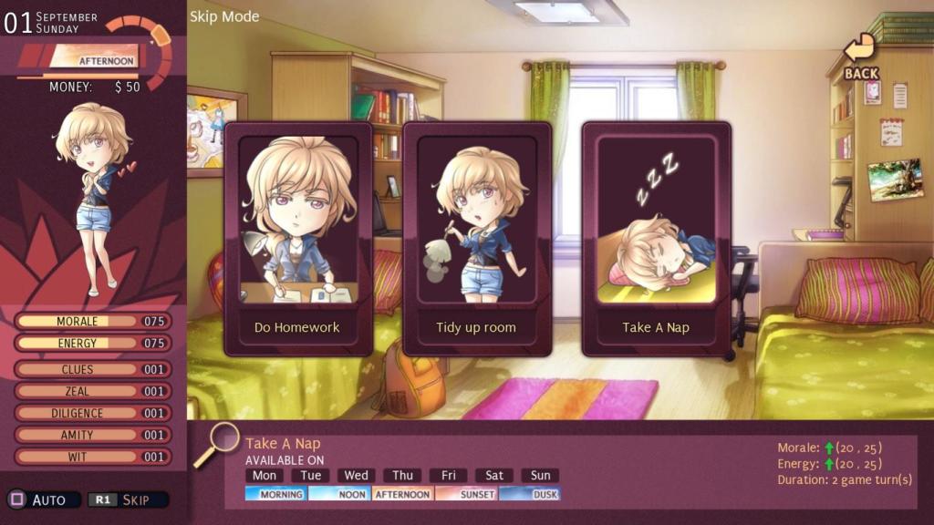 Der andere Modus, der Adventure-Modus, folgt nicht diesem starren Konstrukt und wir können sowohl über eine Schnellreise den Standort wechseln, wo wir mitunter auch alleine sind, wenn sich die anderen Personen zu diesem Zeitpunkt in der Geschichte irgendwo anders aufhalten, sondern können auch aus unterschiedlichen Aktionen zum Zeitvertreib auswählen, die unsere Charakterpunkte verbessern können. Legen wir uns schlafen wirkt sich das positiv auf Nicole’s Ruhe und Müdigkeit aus, oder lernen wir steigern wir unsere Intelligenz, was jederzeit anhand einer Skala im linken Bildrand eingeblendet ist und dem Spiel einen Hauch von RPG verleiht, wobei es natürlich nicht wirklich in die Tiefe geht.