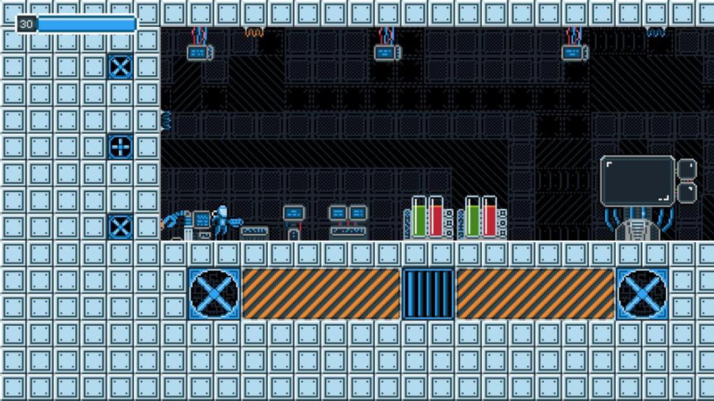 Und leider erkennt man auch gleich beim Start, was das Ziel der Entwickler war, denn man versucht „Metroid“ bis ins kleinste Detail zu kopieren und vergisst dabei leider sich eine eigene Identität zu erarbeiten. Das soll zwar nicht heissen, dass es sich bei „Escape from Tethys“ per se um ein schlechtes Spiel handelt, aber es ist schon etwas frustrierend, wenn man an jeder Ecke Relikte aus längst vergangenen Zeiten erinnert wird und man frische Ideen und fast alle Entwicklungen, die das Genre in den 34 Jahren seit „Metroid“ erfahren hat, vergebens sucht. So hat es zwar eine Übersichtskarte ins Spiel geschafft, aber selbst kleinste Hinweise, wo man eigentlich hin muss, bzw. kann und wo momentan der Weg versperrt ist, sucht man vergebens.