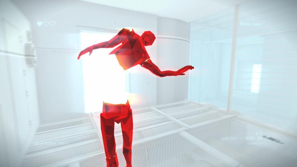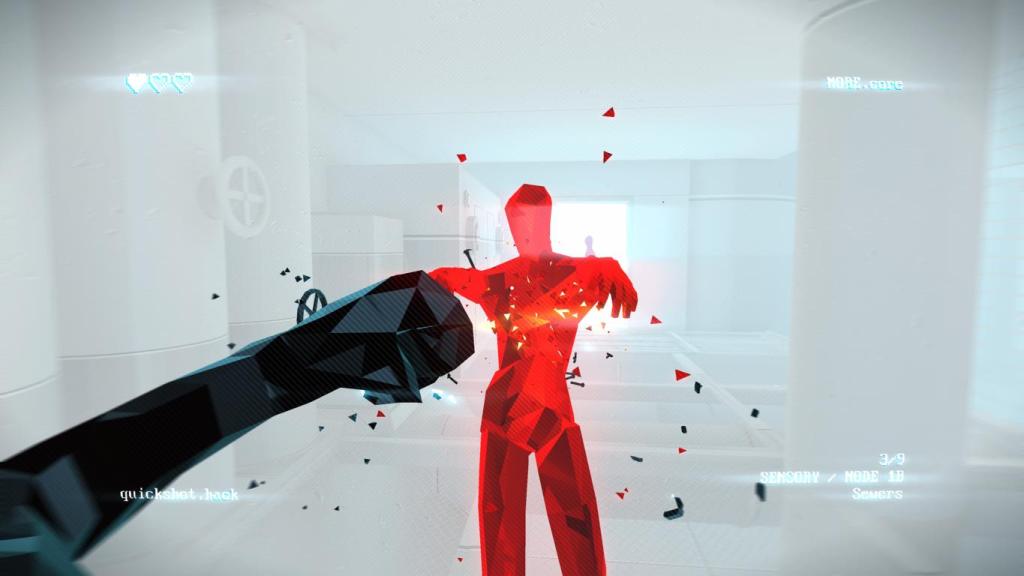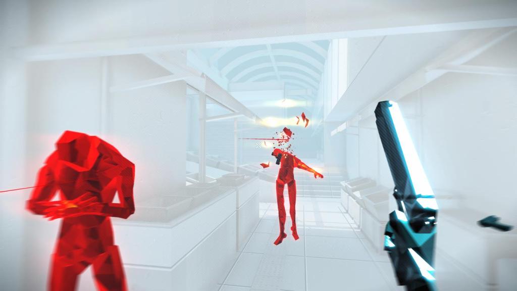 Doch was ist „Superhot“ eigentlich? – Man könnte es im Grunde als Matrix-ähnliche Episoden gepaart mit der Ästhetik einer Computersimulation und farblichen Kodierungen á la „Mirrors Edge“ beschreiben. Jedes Level ist dabei eine kleine abgesteckte Arena, in der es alle Gegner möglichst schnell auszuschalten gilt, wofür wir jedes erdenkliche Mittel anwenden können, um unser Ziel zu erreichen. Wir sehen die Arena, sowie die komplette Einrichtung und Gegner als Polygone. Gegner sind dabei generell rot markiert und der Clou ist, dass die Zeit auf ein Minimum eingefroren ist, wenn wir stillstehen und normal läuft, wenn wir uns bewegen. Wir planen daher jede Bewegung genau, um keinen Schaden zu nehmen, denn ein Treffer genügt und unser Versuch scheitert, wobei wir mit dem Add-on neben ein paar weiteren Annehmlichkeiten sogar Lebenspunkte bekommen, worauf wir aber noch genauer eingehen, wenn wir uns mit den Unterschieden zum ursprünglichen Spiel beschäftigen.