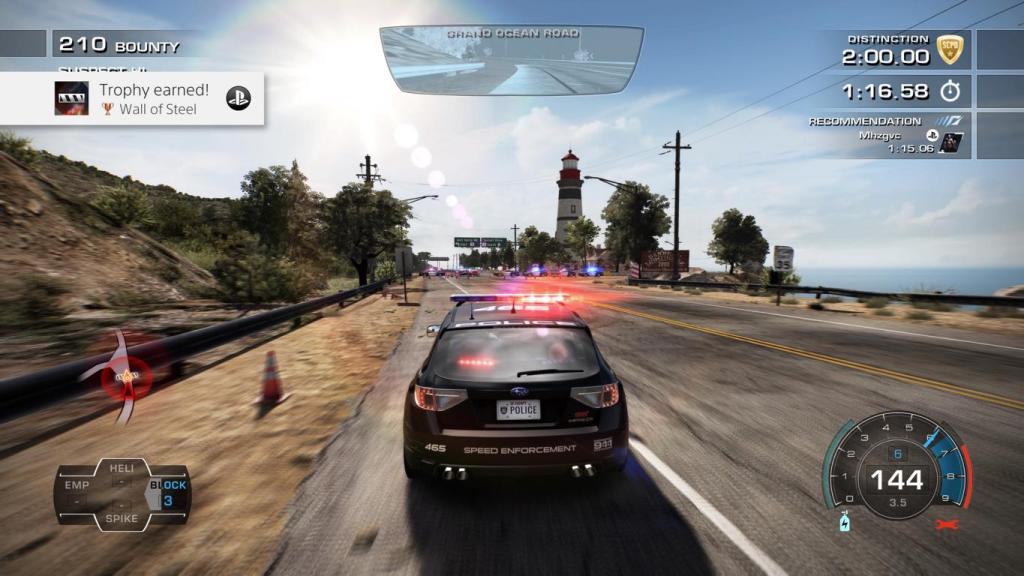 Das Fahrverhalten ist, wie beim Rest der Reihe auch, eher Arcade, also wer einen Simulator mit realistischer Fahrphysik sucht, der wird eher nicht glücklich werden. Dennoch motiviert das Katz- und Mausspiel, wobei die Polizei etwas abwechslungsreicher in ihrer Spielweise ist. Bei den Rennfahrern besteht ein Rennen immer aus einer festgelegten Strecke gegen X andere Fahrer und wer am Ende die Nase vorne hat, gewinnt. Bei der Polizei treten wir gegen die Rennfahrer an, müssen also nicht vorne sein, sondern bewusst die anderen Autos so weit demolieren, dass sie anhalten oder crashen. Dazu stehen uns, jeweils an den Spielfortschritt gekoppelt, unterschiedliche Tool, wie Straßensperren, Nagelteppiche und sogar Hubschrauber-Unterstützung zur Verfügung, die wir auf Knopfdruck herbeirufen können, aber die in ihrer Anzahl begrenzt sind und gleichzeitig einem Cooldown unterliegen. So können wir also nicht mehrere Straßensperren direkt hintereinander setzen.