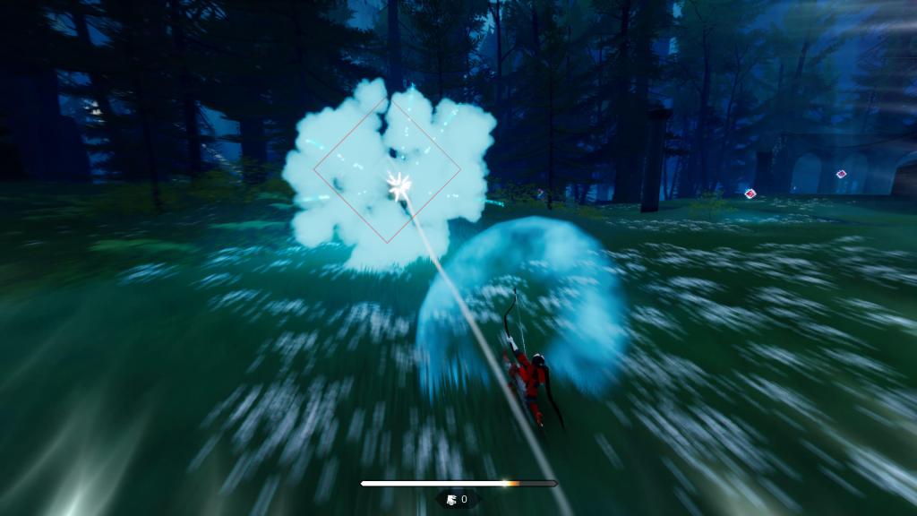 Die Spielwelt ist dabei von Grund aus offen gestaltet und erlaubt es uns prinzipiell überall hin zu gehen, ohne uns das genaue Ziel vorzugeben. Es ist an uns die Welt zu erkunden und wir kommen immer wieder an Bereiche, wo es Rätsel zu lösen gibt, um entweder den weiteren Weg freizuschalten, oder Schätze in verlassenen Tempeln zu finden, die stark an Zelda erinnern. Wir bewegen uns allerdings ohne Pferd fort, sondern sind ausschließlich zu Fuss unterwegs. Neben dem normalen Laufen können wir auch Rennen, was aber Stamina verbraucht. Diese können wir aber durch das Beschießung von Talismanen verlängern, die in Form von Bogenzielen in der ganzen Welt verteilt sind, was   die Jägerin spielerisch und optisch in einen schicken Flow versetzt, kreativ ist und im Kontext des stilisierten Artstyles stimmig ist.
