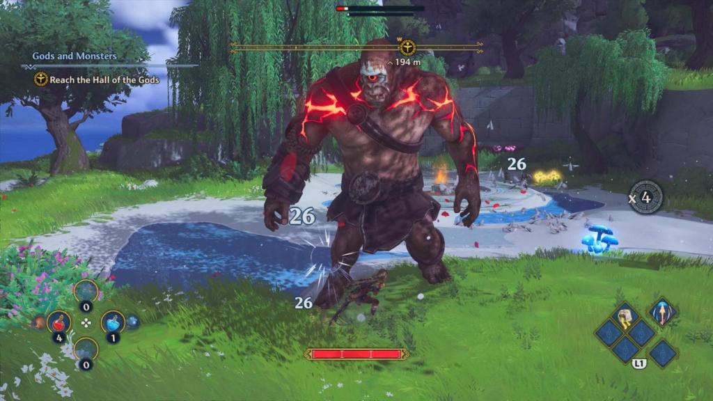 Wir spielen Fenyx, eine oder einen sterblichen, wobei wir sowohl Geschlecht und Aussehen frei bestimmen können. Ich habe mir eine weibliche Fenyx erstellt aus welchem Grund ich ab jetzt das Femininum verwenden werde. Entgegen anderer ähnlicher Spiele handelt es sich bei Fenyx nicht um eine Kriegerin, sondern lediglich um eine Schildträgerin ohne nennenswerte Kampferfahrung, die ihr Abenteuer zu allem Überfluss auch noch komplett unbewaffnet beginnt. Sie erwacht nach einem Schiffbruch am Strand und findet ihre Freunde und alle anderen Menschen zu Stein verwandelt wieder. Die Welt wird bevölkert von Monstern es ist an ihr herauszufinden was passiert ist und wie sie die Menschen zurück verwandeln kann. Nach kurzer Zeit macht sie Bekanntheit mit Hermes, der sie von dort an moralisch unterstützt, denn um überhaupt eine Chance gegen Typhon zu haben wird sie die Hilfe von weiteren Göttern benötigen, die sie allerdings erst befreien muss, da Typhon sie verschleppt und verwandelt hat, um sie unschädlich zu machen. Das sorgt für einige spaßige Momente, da zum Beispiel Aphrodite ihr Dasein als Baum und Ares als Hahn fristet und Typhon’s Zauber nicht leicht zu brechen sind…