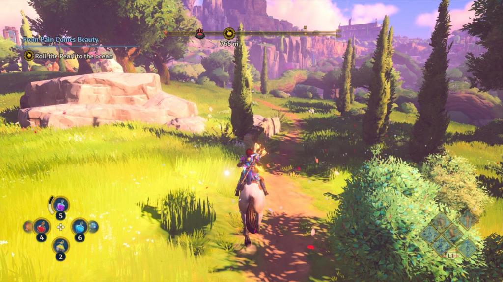 Wir erkunden diese Spielwelt entweder zu Fuss, per Reittier, von denen wir im Spiel unterschiedliche zähmen und damit freischalten können, oder fliegend, bzw. gleitend. Denn wir schalten unterschiedliche Flügel frei mit denen wir aus dem Sprung oder von einem hohen Punkt, gleiten können, was die Fortbewegung ziemlich einfach gestaltet. Zusätzlich gibt es auch Schnellreise, die auf der PS5 in wenigen Sekunden funktioniert. Allerdings beraubt man sich dabei vielen versteckten Elementen in der Spielwelt, die man auf dem Weg finden kann. Denn klassische Türme, oder ähnliches gibt es nicht. Wir können jederzeit in eine Fernsicht wechseln und interessante Punkte über die Vibration des Controllers finden, die danach auf der Karte vermerkt werden. Dazu klettern wir einfach irgendwo hoch, was sich sehr ähnlich zum aktuellen Zelda und auch der Assassin’s Creed-Reihe spielt. Entgehen AC können wir aber nicht uneingeschränkt klettern, sondern nur so viel unsere Stamina uns lässt, was aber nur in Ausnahmefällen zu Problemen führen dürfte, da der Balken sich nach eine kurzen Pause wieder sehr flott auffüllt.