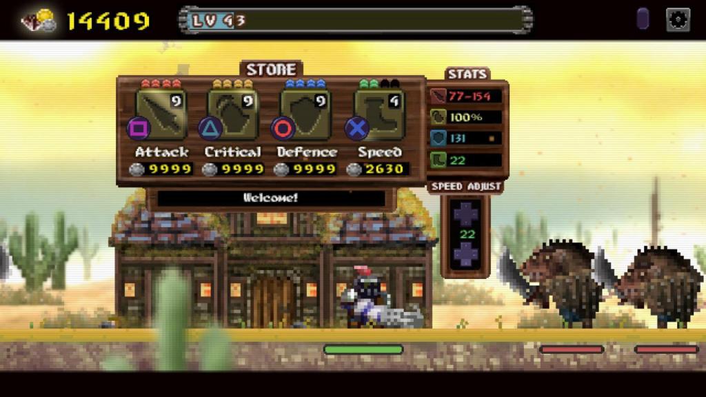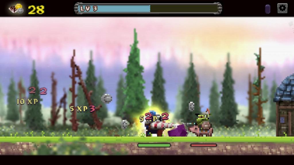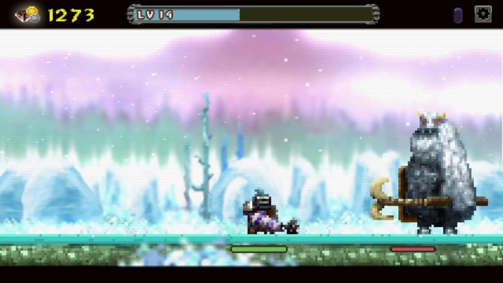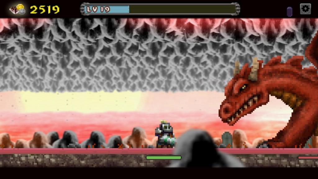 Das beginnt am Anfang noch recht gemächlich, doch schnell müssen wir feststellen, dass mehrere starke Gegner zu viel für unseren Ritter sein können, wenn sich sein Lebensbalken vor dem der Feinde leert. Hier kommt die zweite große Komponente des Spiels zum Tragen: Das Loot, was wir wiederrum zum Aufleveln unserer Fähigkeiten nutzen können. Die teilt sich in unterschiedliche Attribute, wie Angriff, Abwehr, oder Geschwindigkeit und da die Feinde Unmengen an Loot fallenlassen, verwandelt sich das Spiel ziemlich schnell in eine wahrhaftiges „Grindfest“ sondergleichen, bei dem man ständig bemüht ist die Angriffe in Anbetracht des Lebensbalkens zu taxieren, sich im richtigen Zeitpunkt zurückzieht, bis die eigene Lebensenergie wieder aufgefüllt wurde und danach wieder angreift, bis man genug Loot eingesammelt hat, um sich selbst wieder aufzubessern.