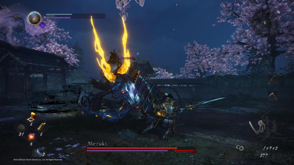Wenn man denn so weit kommt, denn im Gegensatz zum Erstling, der über eine etwas gemächlichere Einführung verfügt, geht es mit der Fortsetzung quasi ohne weitere Umschweife direkt los, wenn man von einem kurzen Tutorial absieht, das sich aber auf die grundlegendsten Mechaniken beschränkt. Und das Spiel startet im Grunde erst mit dem Titelbild so richtig, das erst erscheint, wenn man den ersten Boss plattgemacht hat, der ziemlich anspruchsvoll ist. Man kann also sagen, dass „Nioh 2“ nimmt keinerlei Rücksicht auf uns als Spieler und setzt fast ausschließlich auf die durch die Souls-Spiele etablierte „Learning by Dying“-Mechanik, was gerade zum Beginn in einer überaus hohen Lernkurve mündet. Das liegt aber nicht ausschließlich am Schwierigkeitsgrad, denn zusätzlich muss man sich erst einmal mit den vielschichtigen Spielelementen Vertraut machen. Wer den direkten Vorgänger gespielt hat wird es dabei etwas leichter haben, obwohl auch im Vergleich dazu einiges dazu gebaut wurde.