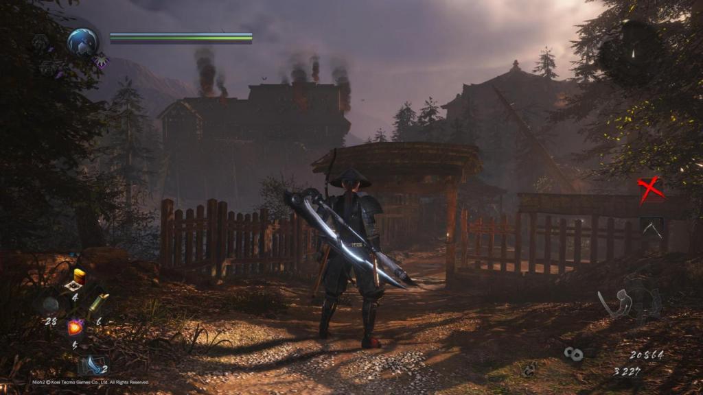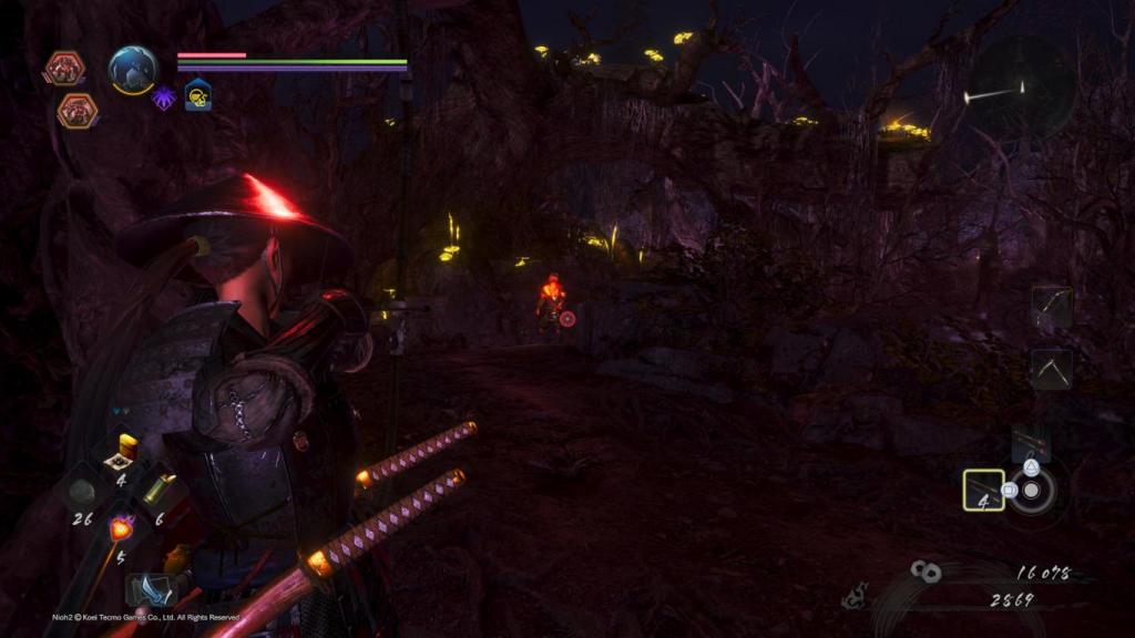 Das Spiel an sich ist analog des Vorgängers in jeweils in sich abgeschlossene Missionen aufgeteilt, die in einem jeweils abgegrenzten Gebiet angesiedelt sind, das wir nach Lust und Laune durchsuchen können. Hier finden wir jeweils ein eigenes Ökosystem aus Landschaft und unterschiedlichen Gegnern wieder, die sich uns in den Weg stellen. Neben den Yokai, die in diesem Teil der Reihe sehr viel prominenter vorhanden sind, als im Vorgänger gibt es auch unterschiedliche menschliche Gegner, die stellenweise zu einer echten Bedrohung werden können, wenn sie in Gruppen auftreten. An mehreren Stellen im Level finden sich jeweils Schreine, die das Äquivalent der Lagerfeuer aus Dark Souls darstellen. An ihnen wir gespeichert, wir können unsere Fähigkeiten aufleveln und uns mit Verbrauchsgütern, wie Heilpulver, Pfeilen, etc. eindecken. Allerdings muss man bei ihrer Benutzung mit Bedacht vorgehen, denn das Beten am Schrein lässt auch alle Gegner wieder auferstehen. Allerdings darf man auch nicht komplett auf die Schreine verzichten, denn wenn wir im Kampf sterben werden wir immer am letzten Schrein, an dem wir gebetet haben, wiederbelegt. Dabei verlieren wir aber unser Amrita, die Währung des Spiels, die zum Aufleveln der Fähigkeiten aufgewandt wird und müssen es am Ort unseres Ablebens wieder aufsammeln. Sollten wir aber nochmal sterben, bevor uns das gelingt ist das Amrita verloren. – Und machen wir uns nichts vor, dazu wird es wahrscheinlich sehr oft kommen. Jeder Gegner stellt eine Herausforderung dar und hat das Potential uns ins Jenseits zu schicken.