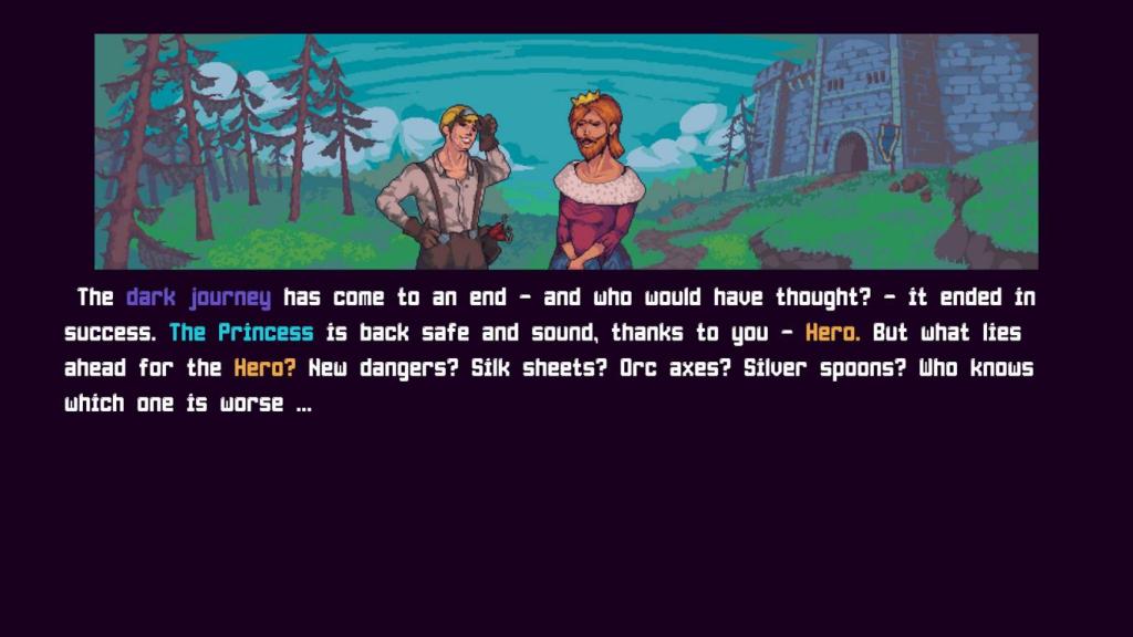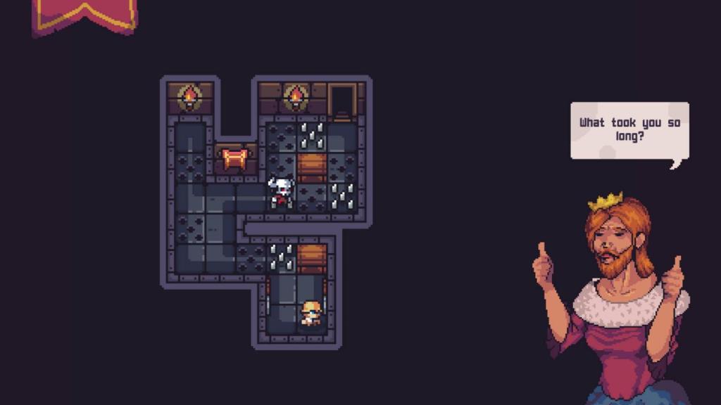 Technisch ist das Spiel zwar keinesfalls spektakulär, aber dennoch schön anzusehen und reiht sich Design-Technisch in ähnlich gelagerte Spiele, wie „Warlock’s Tower“ ein, das allerdings von der Konkurrenz bei Ratalaika Games herausgebracht wurde. Die Grafik ist ansprechend, die Levels sind angenehm abwechslungsreich und die bärtige Prinzessin, die konstant neben dem Spielbildschirm eingeblendet ist hat einige witzige Kommentare in petto, die unsere Aktionen in bester Mystery Science Theather-Manier untermalen. Einzig der CRT-Filter, der per Default an ist und in ähnlicher Weise auch schon bei „Bucket Knight“ zum Einsatz kam, gefällt mir nicht wirklich, da er das Bild meiner Meinung nach zu sehr verzerrt und es unnatürlich milchig erscheinen lässt, weswegen ich jedem empfehlen würde diesen Filter direkt in den Optionen auszuschalten.