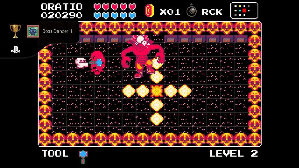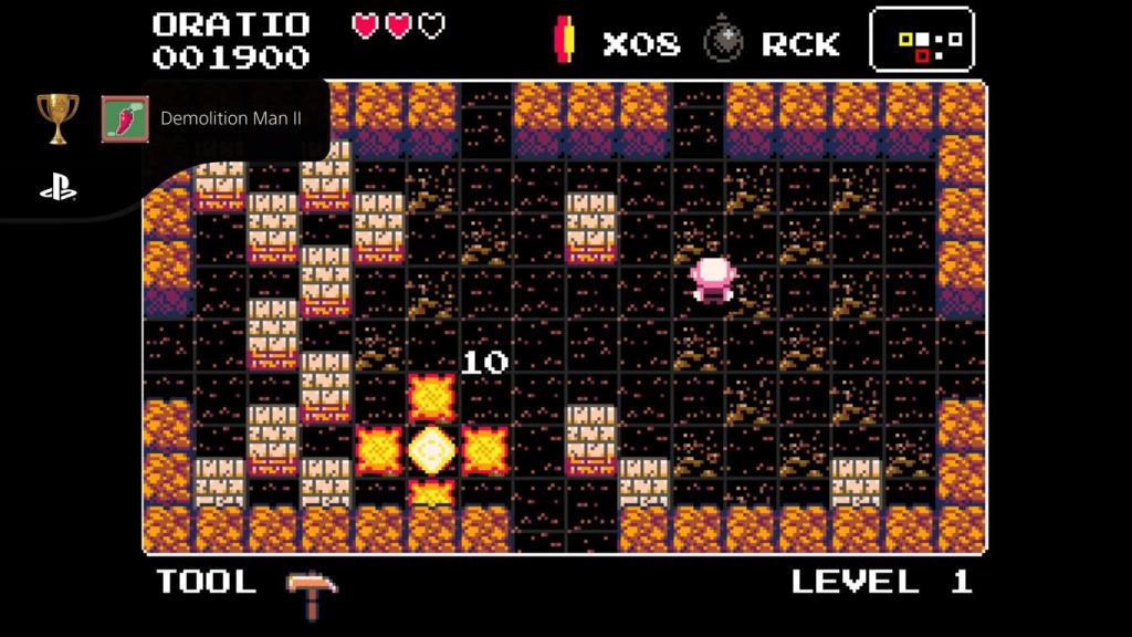 Das Spielprinzip bedient sich unterschiedlichen Quellen. Wir sehen das Geschehen aus der Top-Down-Ansicht und sehen immer nur einen Bildschirm, der aus jeweils einem Raum des Dungeons besteht. Haben wir alle Gegner auf dem Bildschirm besiegt, sind wir frei uns zum nächsten zu bewegen. Oratio kämpft dabei mit einer Spitzhacke, die analog zu Link’s Schwert in „The Legend of Zelda“ eine kleine Druckwelle loslässt. Zusätzlich können wir unendlich Bomben legen, die wenig später explodieren und alles in einem bestimmten Radios mit sich reißen, weswegen wir auch aufpassen müssen nicht davon erwischt zu werden.