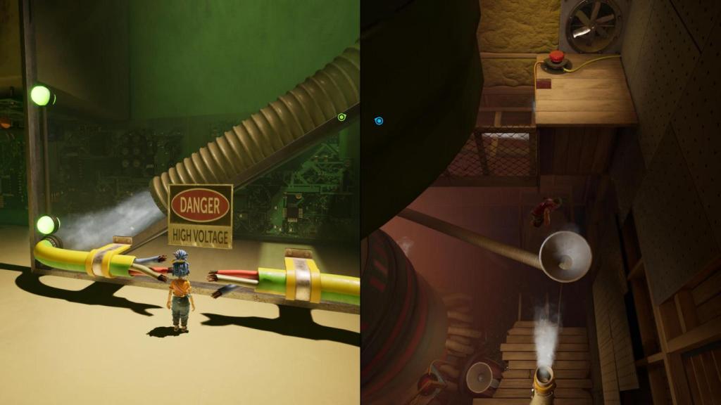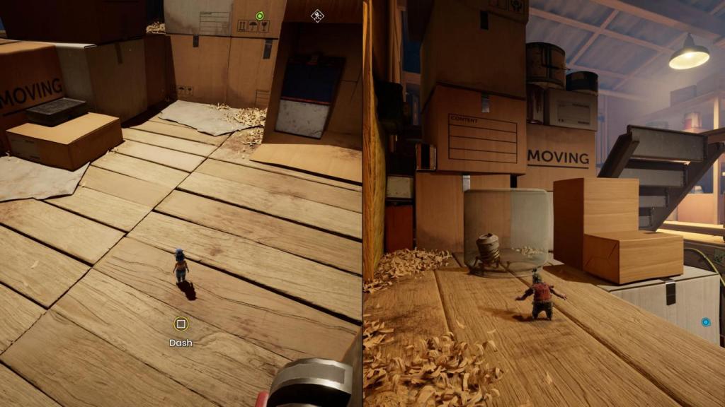 Die Animationen und die Geschichte, die trotz der ernsten Prämisse um Scheidung, überaus witzige Züge annimmt, bewegen sich auf dem Niveau eines Animationsfilms, wie von Pixar oder Dreamworks und bieten damit Unterhaltung für unterschiedliche Altersklassen, so lässt sich das Spiel zum Beispiel auch gut mit Kindern spielen ähnlich wie man es auch von den Lego-Spielen kennt. Das Spielprinzip ist dabei ein 3D-Plattformer mit Fokus auf teilweise recht ausufernde Rätsel, die sich in den meisten Fällen ausschließlich gemeinsam lösen lassen. So muss gleich zum Beginn ein Spieler einen Staubsaugerschlauch so halten, dass der andere Spieler davon eingesaugt und an entsprechender Stelle wieder ausgepustet wird, um danach einen Schalter zu betätigen. Verbunden werden diese Abschnitte von gut designten Plattformer-Abschnitten, die es schaffen zwar Anspruchsvoll genug zu sein, ohne dabei zu schwer zu werden, was jüngere Spieler abschrecken dürfte. Zwar hatte ich in ein paar Momenten dennoch das Problem, das alle 3D-Plattformer mit sich bringen, dass man zu kurz springt, da man eine Entfernung falsch abgeschätzt hat, aber insgesamt war das eher die Ausnahme und da die Rücksetzpunkte fair gesetzt sind, war das auch nie ein Problem. Beide Charaktere verfügen über Sprung, Doppelsprung und Rennen als Fähigkeit, wobei im Spielverlauf noch unterschiedliche Fähigkeiten spezifisch für eine der Figuren dazukommen, was den Spielverlauf jedes Charakters etwas anders verlaufen lässt und mich selbst nach dem Durchspielen mit einem Charakter neugierig darauf gemacht hat, wie es sich mit dem anderen Charakter spielt, auch wenn das den Verlauf der Geschichte als solches natürlich in keiner Weise verändert.