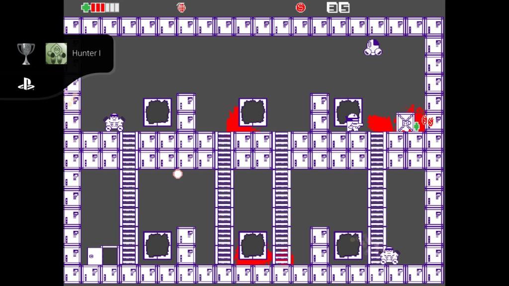 Dabei sieht auf dem Papier eigentlich alles gut aus, denn es handelt sich um einen Arcade-Shooter, der bei dem das einzige Ziel ist alle Gegner auszuschalten, um zum nächsten Level vorzudringen. Jedes Level besteht Arcade-typisch aus einem Bildschirm, der als Arena fungiert. Das Lavout ist, wie bei frühen NES-Titeln, wie „Ice Climber“, oder dem originalen „Mario Bros“ in 2D gehalten und besteht aus unterschiedlichen Ebenen. Wir steuern einen kleinen Avatar, der mittels Dreiecktaste schießt und neben Springen auch Granaten werfen kann, sofern man diese vorher eingesammelt hat. Weiter gibt es noch die Möglichkeit Tische umzuwerfen, um dahinter in Deckung zu gehen, oder einen „Knee-Slyde“ durchzuführen, was ich aber ehrlich gesagt im Spielverlauf nicht einmal benutzt habe, da es zwar witzig aussieht, aber uns langsamer und gleichzeitig zum besseren Ziel für gegnerische Projektile macht. Da fand ich es leichter über das normale Rennen und Springen auszuweichen.