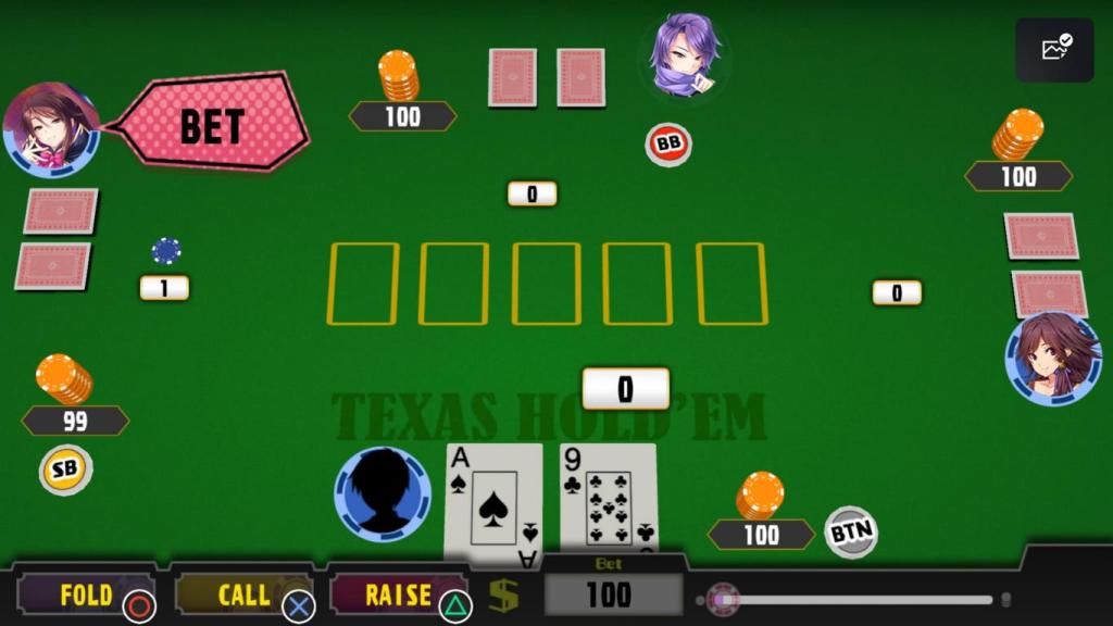 Nun ja, was soll man sagen, es ist eben Poker. Genauer Texas Hold’em, denn wir zumindest gehofft hat, dass es unterschiedliche Poker-Varianten gäbe, dem ziehe ich diesen Zahn am besten sofort. Und im Gegensatz zu anderen Pokerspielen spielen wir eben nicht gegen gesichtslose andere Spieler, sondern gegen sexy Manga-Mädchen, die auch nicht mit ihren weiblichen Reizen geizen, auch wenn man mit den Damen, abseits der Auswahl einer Gegnerin, keinerlei Kontakt hat. In der Spielrunde, die immer aus uns drei weiteren Spielerinnen besteht, sehen wir lediglich einen kleinen Avatar an den Rändern des virtuellen Tischs.