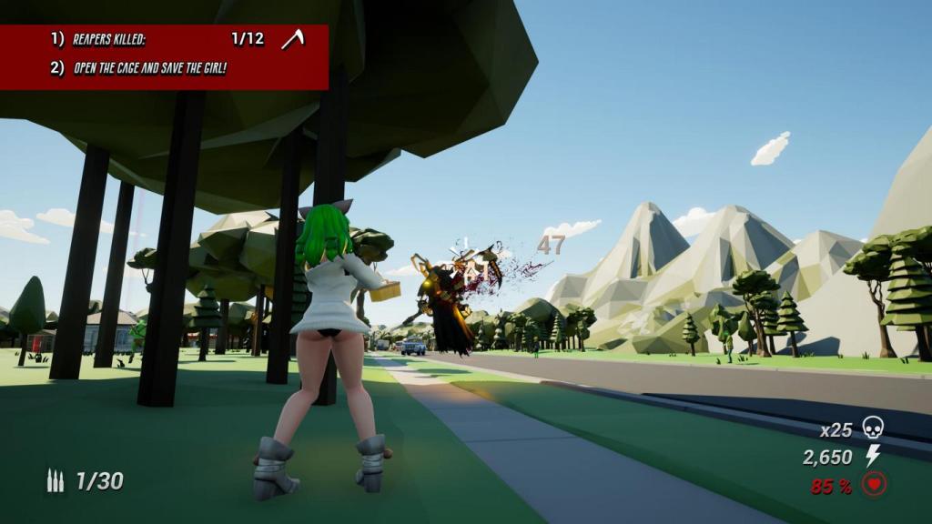 Das Spielprinzip ist so simpel, wie eingängig, denn es geht darum das titelgebende Böse zu besiegen. Dafür stehen in drei Levels, jeweils zwei unterschiedliche Spielmodi zur Verfügung „Befreiung“, oder „Überleben“, was sich beides eher wie ein Multiplayer-, anstatt Singleplayer-Spiel anfühlt. Denn wir werden mit einem selbst-erstellbaren Manga-Mädchen in eine offene Map geworfen, die von Orks, Zombies, Skeletten, oder auch dem leibhaftigen Sensenmann überrannt wurde, die uns ans Leder wollen. In „Befreiung“ ist das Ziel insgesamt 12 Sensenmänner zu töten und ein gefangenes Mädchen zu befreien. Und in „Überleben“ ist unser Ziel so lang es geht am Leben zu bleiben.