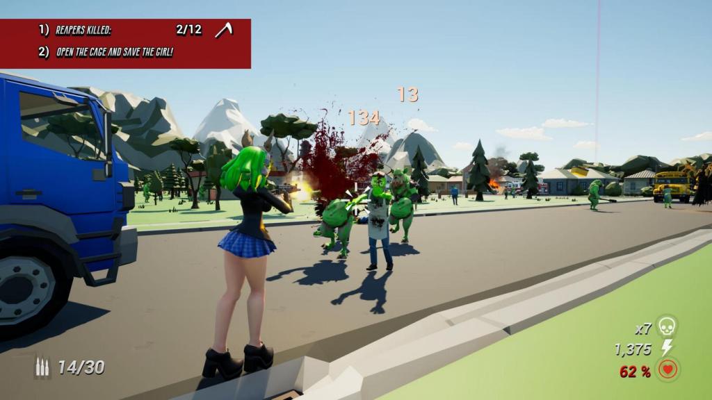 Entgegen anderer Spiele des Publishers, die normalerweise ausschließlich in 2d, oft gepaart mit klassischer Pixelgrafik, gehalten sind, haben wir es bei „Hentai vs Evil“ mit einem modernen 3D-Spiel zu tun. Wir sehen das Geschehen aus der 3rd-Person Verfolgeransicht und die Maps sind überaus detaillierte Arenen, eine Kleinstadt, eine Pirateninsel, sowie eine Großstadt. Und für unseren Amoklauf gegen die unendlichen Horden des Bösen stehen uns viele unterschiedliche Waffen, von Pistolen, Maschinenpistolen, Maschinengewehr, Schrotflinte, oder sogar Raketenwerfer zur Verfügung, die sich jeweils unterschiedlich verhalten und sich in Beziehung Feuerkraft und Magazinkapazität unterscheiden.