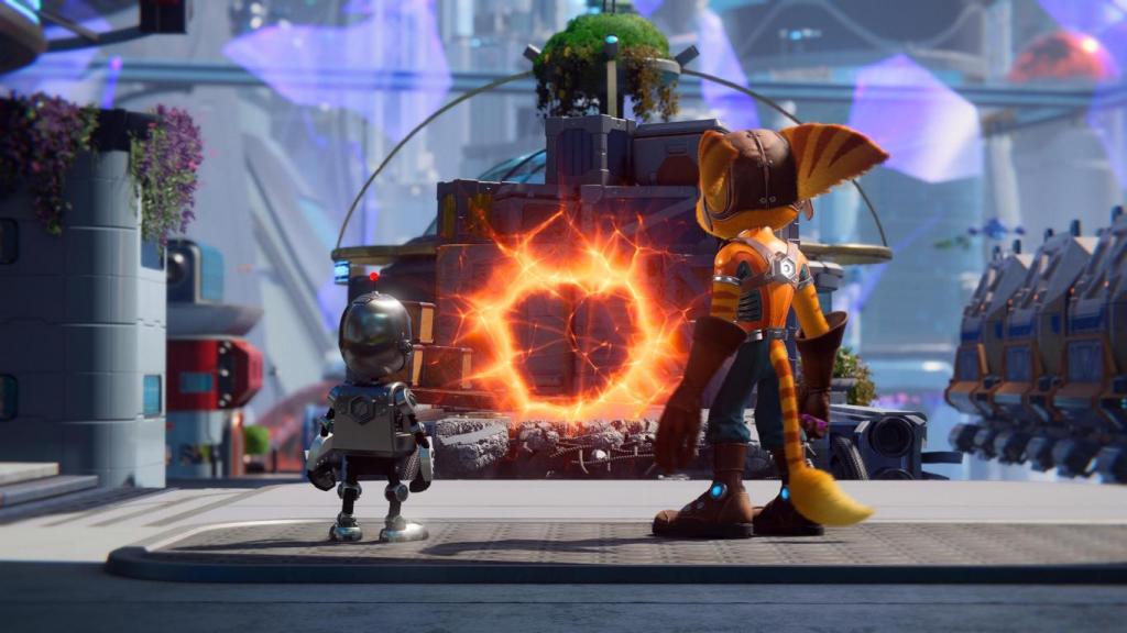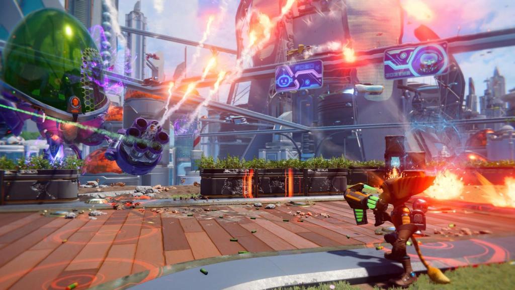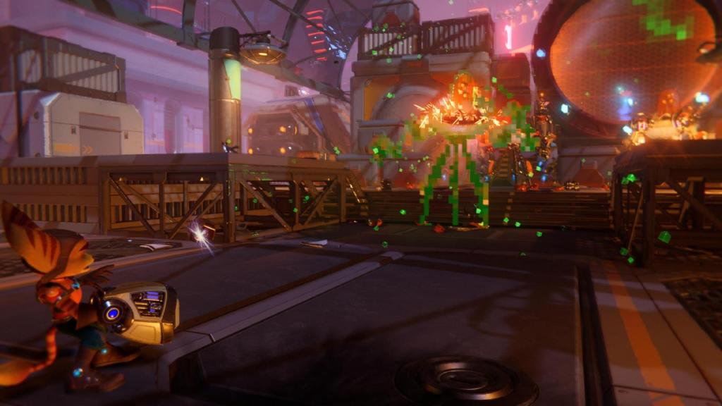 Spielerisch unterscheidet sich das Spiel nur in Details von der etablierten Formel. Wir springen und schießen uns durch unterschiedliche Areale, während wir das Geschehen aus der 3rd-Person Verfolgeransicht sehen. Die unterschiedlichen Areale, in diesem Fall unterschiedliche Planeten, sind recht offen angelegt, laden auch zum freien Erkunden und dem Finden von jeder Menge Sammelobjekte ein, wobei der in Haupt- und Nebenmissionen Fortschritt linear angelegt ist. In Sachen Fortbewegung stehen uns teilweise auch Fortbewegungsmittel, wie Schnecken, oder auch Hoverboots zur Verfügung, die das Hoverboard ersetzen, das es früher in der Reihe gab. Wer bereits einen Teil der Reihe gespielt hat weiß, dass die Waffen im Spiel einen besonderen Stellenwert einnehmen und Rift Apart ist dabei selbstverständlich keine Ausnahme. Denn nicht nur übersteigt das Raster an Waffen alle bisherigen Teile, sondern auch viele „alte Bekannte“ feiern ihr Comeback. So waren auch meine persönlichen Favoriten, wie der „Pixelizer“ und der „Bouncer“ wieder mit von der Partie, wobei man letzteren erst für das New Game+ freischaltet. Hier sollte aber jeder auf seine Kosten kommen, denn immerhin gibt es nicht nur ein Waffen Rad, sondern gleich drei Stück, so viele Waffen beinhaltet das Spiel…