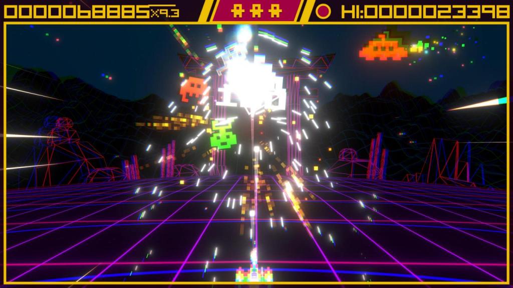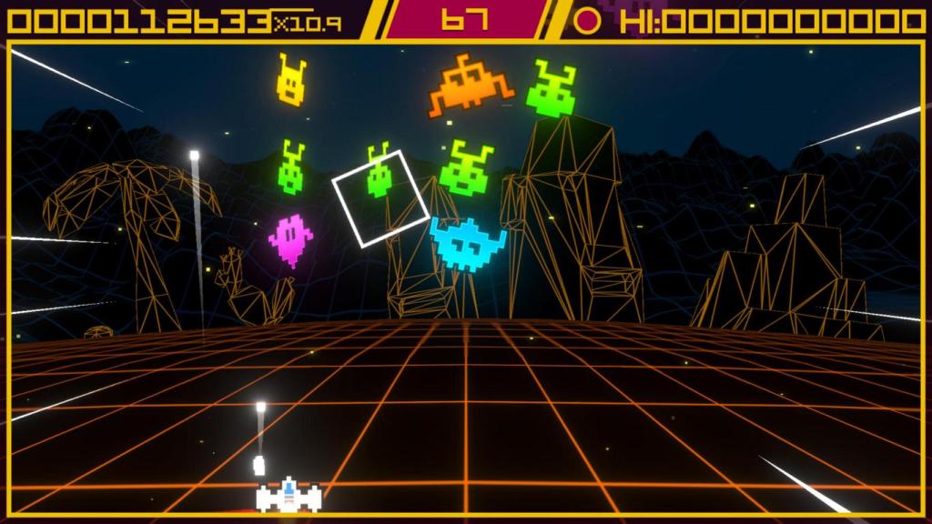 Der Vorgänger hat das bekannte Konzept aus Space Invaders genommen, leuchtende Neonfarben drauf gesetzt und zu guter Letzt noch ein paar Modi und Herausforderungen geschnürt, die für Abwechslung sorgen. Wir steuern ein kleines Raumschiff, dessen einziges Ziel ist die unterschiedlichen Außerirdischen Angreifer abzuschießen. Zugegeben ist das zwar nicht besonders vielschichtig und mehr Story ist auch nicht vorhanden, aber so braucht es auch keine aufwendigen Tutorials oder ähnliches. Einfach Starten und schon kann es losgehen mit dem Arcade-Spaß. Von den Angreifern gibt es unterschiedliche, die dann in jeweils unterschiedlichen Pattern angreifen. Hier bekommt die klassische Formel einen kleinen Twist, denn wir müssen sowohl diesen Schüssen, sondern auch abgeschossenen Schiffen, die herunterfallen oder Hindernissen auf dem Boden ausweichen. Nebenbei lassen sich durch bestimmte Aktionen auch zusätzliche Bildelemente, wie bildschirmfüllende Explosionen oder auch andere Verzerrer hervorrufen, die man je nach Belieben, aber auch ausschalten kann, wodurch man sich aber einiger imposanter Schauwerte beraubt.
