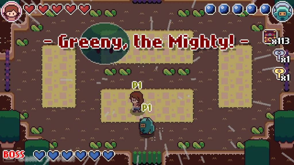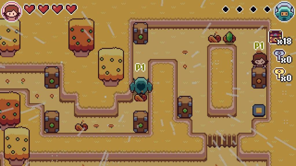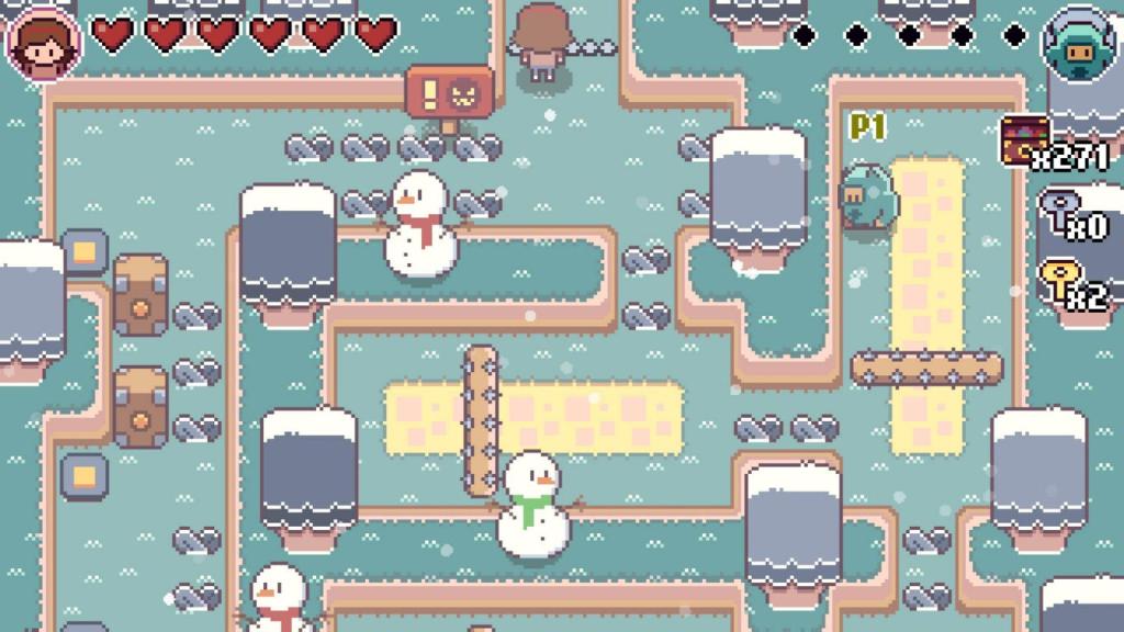 Hatte ich seinerzeit „Super Box Land Demake“ mit Sokoban verglichen und „Milo’s Quest“ kann man problemlos eine gewisse Anlehnung an Zelda attestieren, so ist „Mina & Michi“ eine Kombination beider, also ein Action-Adventure mit einer isometrischen Draufsicht, angesiedelt in einer recht offenen Spielwelt, mit Item-basiertem Fortschritt, fiesen Bossen und jeder Menge Schieberätseln. Wir spielen entweder sowohl Mini, aber auch Michi und können je nach Spielmodus entweder beide gleichzeitig, also über den gleichen Controller, steuern, oder übergeben einen Charakter im 2-Spieler-Modus an einen weiteren Mitspieler. Mini ist ein junges Mädchen und Michi ist dabei ihr ständiger Begleiter in Form eines großen blauen Monsters (?), genau wird das nicht wirklich erklärt. Ebenso nebulös bleibt der Rest der Geschichte, denn wir erfahren im Grunde gar nichts zur Motivation hinter den Charakteren, noch den Zielen. Wir finden uns einfach in einer kunterbunten Welt wieder, die wir zum Spielstart entweder in Frühling, Somme, Herbst, oder Winter ansiedeln können, was aber abseits einer anderen Farbpalette, keine Veränderung mit sich bringt und beginnen unsere Reise.