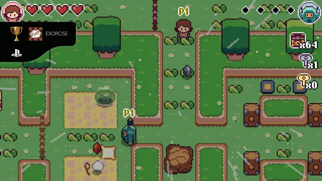 Direkt fällt dabei die etwas merkwürdige Steuerung beim Solo-Spiel ins Auge und ich dachte im ersten Moment ich hätte ausversehen den Co-Op-Modus ausgewählt, denn wir steuern auch im Solo-Modus beide Charaktere und das mit einem Controller, was gerade bei Bossen, wenn wir mit beiden Charakteren parallel agieren müssen, in einem heillosen Chaos enden kann. Denn wo andere Spiele uns beispielsweise per Knopfdruck zwischen Charakteren wechseln lassen, steuert der linke Stick Mina und der rechte Stick Michi und auch die verbleibenden Tasten sind zwischen den Charakteren aufgeteilt. Ich bin zwar recht gut im Multitasking, doch hier ist es mir mitunter sehr schwer gefallen beide Charaktere gleichzeitig zu steuern, ohne das man ständig irgendwo hängen bleibt. Leichter ist es dann allemal im Co-Op-Spiel, wo jeder einen Charakter steuert. Es hat aber einen klaren Sinn, dass wir immer beide Charaktere im Gepäck haben, denn die meisten Rätsel erfordern den abwechselnden Einsatz, um auf die Lösung zu kommen. Spielerisch steuern sich beide Charaktere zu einem gemeinsamen Ziel, so muss manchmal ein Charakter einen Schalter betätigen, dass der andere Charakter durchkommt, oder man muss ein Boxen-Puzzle von zwei unterschiedlichen Seiten angehen. Dabei gibt es generell immer mehrere Lösungswege, aber bei den Rätseln auch Sackgassen, die sich aber wenigstens über ein Verlassen des Bildschirms rückgängig machen lassen.