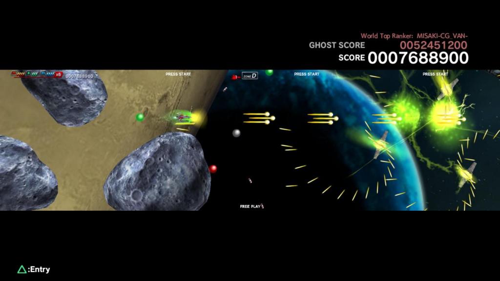 Das Spiel bietet dabei je nachdem, ob wir die Taste für den Burstangriff drücken, oder festhalten (und je nachdem, wie wir unser Schiff ausgerüstet haben) unterschiedliche Angriffe für unterschiedliche Situationen, was clever in das Stagedesign implementiert wurde. Gleiches gilt für unsere Schussrichtung, die bei den meisten Shmups fest vorgegeben ist, sich aber hier per Schultertaste wechseln lässt, was nicht nur notwendig ist, um Hindernissen auszuweichen, sondern auch essenziell ist, um die Gegner auszuschalten, die von allen Seiten kommen können.