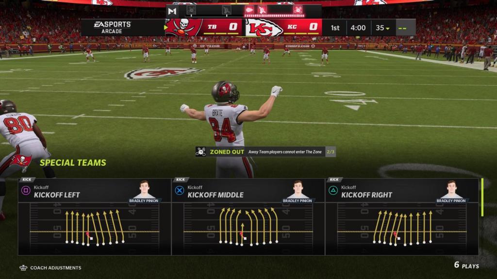 An dieser Stelle muss man sich nämlich in Erinnerung rufen, dass es sich bei Madden eher um eine taktische Simulation und erst nachgelagert um ein Sportspiel handelt. Es gibt zwar auch einen Arcade-Modus, doch dieser ist keinesfalls mit beispielsweise einem FIFA vergleichbar. Können wir bei FIFA wahrscheinlich jederzeit den Controller weitergereicht bekommen und nahtlos weiterspielen, so ist das bei Madden mit ziemlicher Wahrscheinlichkeit zu Scheitern verurteilt. Nicht nur dass es weniger Gameplay an sich gibt und sich die Teams ohnehin nach jedem Down neu aufstellen, wir müssen auch unterschiedliche Spielzüge wählen und diese dann versuchen korrekt auszuführen. In diesem Zusammenhang ist auch eine interessante Neuerung implementiert, die als „Gameplay Momentum“ bezeichnet wird und zufällige Ereignisse, wie aus dem „echten Leben“ mit einfließen lässt, wenn unsere Mitspieler auch mal Fehler machen, oder die. Kommunikation gegen tosende Fans des gegnerischen Teams schwerer fällt.