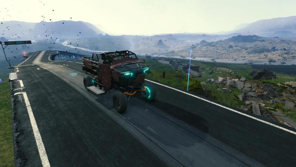 Doch neben den ganzen technischen Spielereihen haben es auch inhaltliche Erweiterungen ins Spiel geschafft. So gibt es neue Missionsstränge, in denen wir Bunkeranlagen infiltrieren müssen, was selbstverständlich auch mit der ein oder anderen Metal Gear-Referenz aufwartet. Hierzu bekommt man bereits im ersten Gebiet Zugriff zu eine Elektroschockwaffe, der „Maser Gun“, die gerade die ersten Encounter mit den Mules um einiges einfacher macht. Zwar ist Sam auch ohne Waffe in der Lage einen Mule mit ein paar Faustschlägen auszuschalten, aber mit der Waffe kann man auch aus einer gewissen Distanz agieren. Über die Terminals der Verteilzentren kann man zusätzlich eine VR-Firing Range laden, die uns beim Erlernen der Schussmechanik helfen, oder sogar in Rankings teilnehmen lassen, was an die „Metal Gear Solid: The VR-Missions“ erinnert. Weiter gibt es Zugang zu vielen neuen Items, wie einem Lasten-Bot, einem Support-Skelett, das uns hilft bereits früher größere Gewichte (sicher) zu tragen, bis hin zu neunen Bauwerken, wie einer Rennstrecke, die man stilecht mit einem Roadster befahren kann. Und auch die Optik kommt nicht zu kurz, denn wir können nun unsere Ausrüstungsgegenstände personalisieren, wofür es sogar Promotional Items aus der Half-Life-Reihe und „Cyberpunk 2077“ gibt. Die neuen Inhalte fügen sich nahtlos in das Spiel ein, was sogar so weit ging, dass ich mir bei einzelnen Punkten gar nicht sicher war, ob etwas bereits im Base Game gab. Dadurch bietet der Director’s Cut auf jeden Fall einen Mehrwert, sowohl für neue, aber auch wiederkehrende Spieler, denen sogar die Option offensteht ihren PS4-Spielstand zu importieren und dort weiterzumachen, wo man aufgehört hat. – Und bevor es jemand in die Kommentare schreibt: Ja, die Kooperation mit „Monster Energy“ scheint ausgelaufen zu sein, denn bekam Sam in der PS4-Version nur prominent in die Kamera gehaltene „Monster-Energy“-Drinks, so hat man im Director’s Cut auf diese Art der Werbung verzichtet, was ich persönlich sehr begrüße, da es einfach nicht stimmig wirkte.