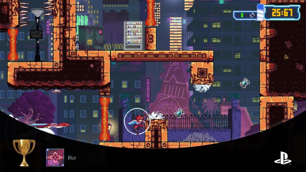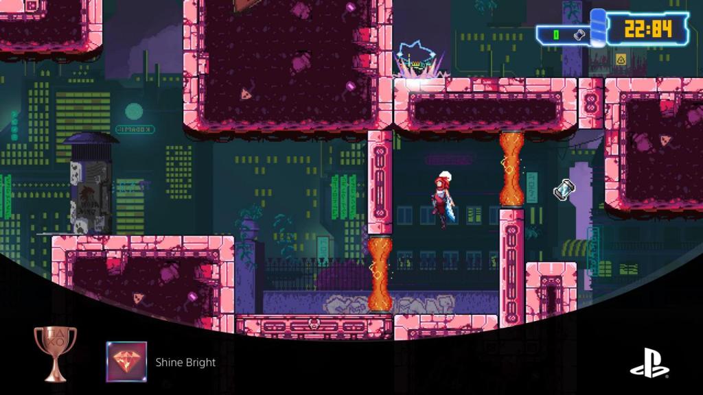 Neben der Zeit als wahrscheinlich unerbittlichsten Gegner findet man in den Levels auch „normale“ Gegenspieler und jede Menge Fällen, die uns versuchen zu bremsen. Doch Jack hat dafür noch ein paar Asse im Ärmel, denn nicht nur ist sie mit einem coolen Schwert bewaffnet, das mit den meisten Gegnern in wenigen Schlägen kurzen Prozess macht, sondern sie verfügt zusätzlich über einen Wurfdolch, der es ihr erlaubt über kurze Distanzen zu teleportieren, was ihr komplett neue Wege durch die Levels eröffnet. Und da es darüber hinaus auch in bester Ninja Gaiden-Manier Walljumps, Solides und sonstige Tricks gibt und jedes Level unterschiedliche Wege bereithält, bietet das Spiel viel Raum für erneute und alternative Lösungswege.