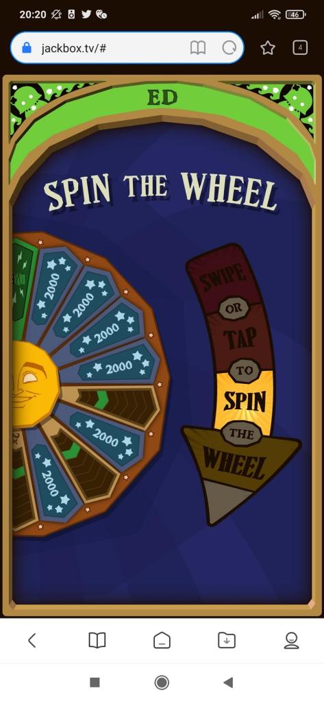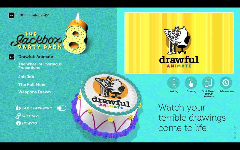 Komplett neu sind „Job Job“, „The Poll Mine“, „Weapons drawn“ und mein persönlicher Favorit „The Wheel of enormous Proportions“. Nicht ganz neu ist „Drawful Animate“, was eine Weiterentwicklung von „Drawful“ ist. Hierbei müssen wir nun nicht nur ein Bild malen, das uns aufgegeben wurde und die anderen Spieler müssen es erraten, sondern mehrere Bilder, die dann als Animation dargestellt werden und einen ganzen Satz abbilden sollen. Und dass es sich dabei nicht um alltägliches handelt wird deutlich bei einem der ersten Sätze, den ich malen sollen, der „Vampire throwing a tantrum“ war. Und um die anderen Mitspieler zu verwirren kann man sogar falsche Beschreibungen als Antworten hinzufügen, was zusätzliche Punkte beschert, wenn sie ein Spieler auswählt. Die Ergebnisse sind meist einfach nur köstlich, auch wenn man bei Zeichnen etwas aufpassen muss, da es keinen Undo-, oder Korrektur-Knopf gibt.