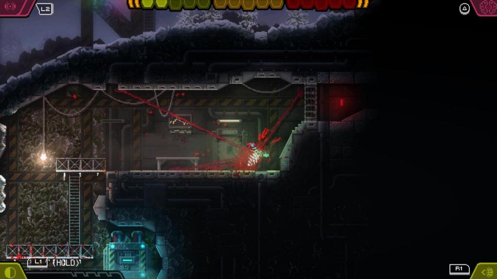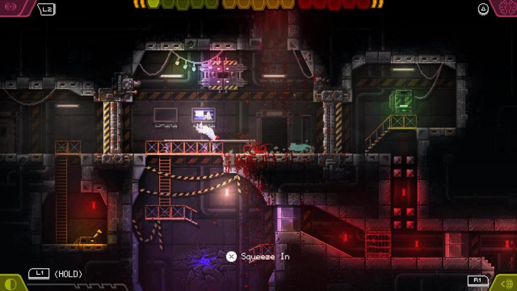 Besonders erwähnenswert ist die interessante Art der Fortbewegung und die allgemeine Steuerung, denn da wir einen schwabbelnden Parasit steuern, klettern wir gekonnt an Wänden und Decken entlang, was echt schickt animiert ist und wirklich ein Gefühl des klebrigen „waberns“ imitierten. Mit dem rechten Stick steuern wir die Tentakel und greifen mit dem rechten Trigger, mit dem wir gekonnt Türen einreißen, die Einrichtung demolieren, oder auch Feinde zerfetzten, was besonders eklig animiert wird. Mit den Upgrades bekommen wir unter anderem die Fähigkeit dazu uns kurzzeitig unsichtbar zu machen, Stacheln auszuführen, oder auch unsere feste Form unter Wasser in eine Schwarm-ähnliche Gestalt zu wechseln, um selbst durch kleinste Durchgänge schwimmen zu können. Die Steuerung ist trotz vieler unterschiedlicher Fähigkeiten aber nicht überladen, zumal es auch mit jeder neuen Fähigkeit auch kleine Tutorials gibt.