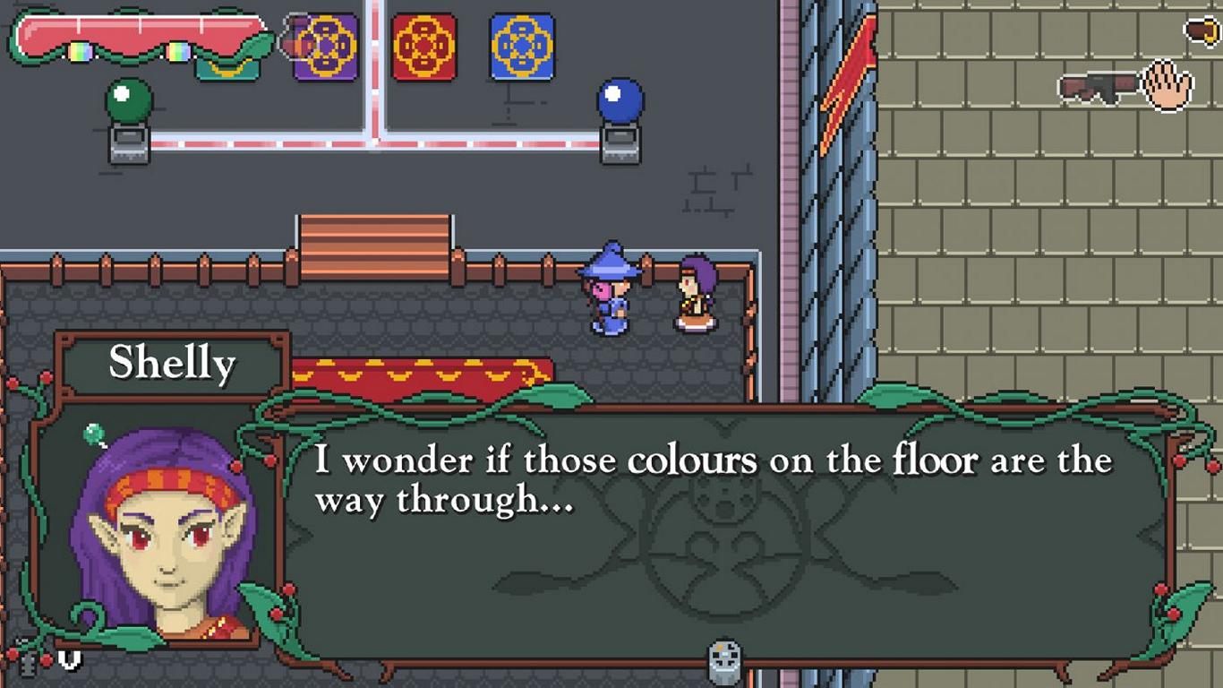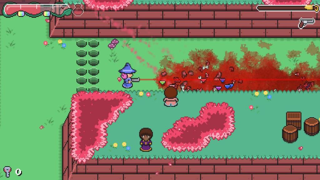 Optisch wie spielerisch ist das, abgesehen von den Schusswaffen versteht sich, orientiert sich das Spiel stark an „The Legend of Zelda: A Link to the Past“ und weicht lediglich in einigen kurzen Shooter-Abschnitten, die uns auf Colette’s Hexenbesen fliegen lassen, davon ab. Den Großteil der Spielzeit verbringt man allerdings in der typischen Topdown-Ansicht, bewegt sich über eine recht umfangreiche Oberwelt, spricht mit NPCs und betritt dann und wann in sich abgeschlossene Dungeons, die es zu bezwingen gilt. Das steuert sich jedoch sehr viel Actionreicher, da das komplette Kampfsystem als Twin-Stick-Shooter aufgebaut ist und wir Colette’s Laufrichtung unabhängig von ihrer Schussrichtung steuern können. Der Rest ist Genre-typische Standardkost mit einigen Rätseln, unterschiedlichen Tränken und Waffen, die wir im Spielverlauf bekommen und dem ein oder anderen Bosskampf, die aber insgesamt überraschend abwechslungsreich ausgefallen sind. Neben Kampf als Singleplayer erlaubt uns das Spiel sogar jederzeit einen Couch Co-Op Partner mitzunehmen, obwohl das Spiel dadurch etwas zu leicht wird, da die Anzahl der Gegner und die Energie der Bosse nicht skaliert, sondern unverändert bleibt. Aber es ist immerhin schön zu wissen, dass es immer mal wieder Spiele gibt, die im Co-Op spielbar sind.
