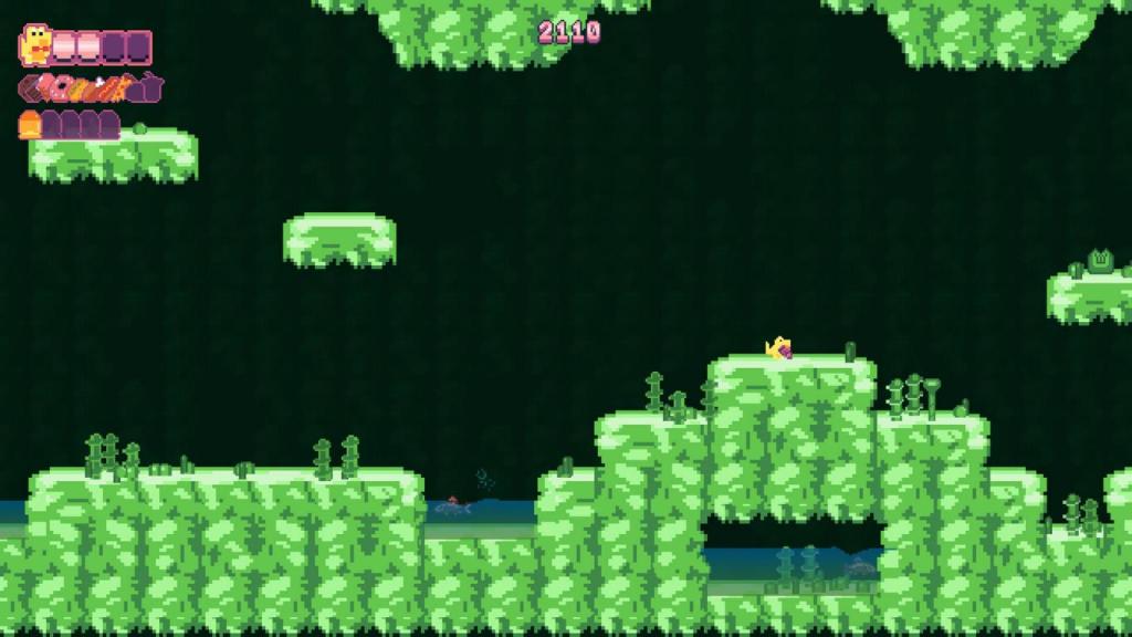 Lediglich die Bosse bieten dabei eine willkommene Abwechslung, denn dabei wechselt das Gameplay in einen fordernden Arena-Kampf mit Bullet Hell-Einschlag. Unsere Waffen und Fähigkeiten sind gegen diese dicken Fieslinge ineffektiv und wir müssen stattdessen Wege finden die Arena für unsere Zwecke einzusetzen. Das ist nicht nur eine besondere Herausforderung, sondern ist ein Element, das den normalen Levels gut getan hätte, denn die laufen leider von Anfang bis Ende gleich ab: Springen, Schwingen, Ausweichen und letztendlich Cocos retten. Zusätzlich bekommen wir alle paar Levels Zugriff zu einem Power-Up, wie schnellere Geschwindigkeit, höher springen, oder ein Schutzschild, doch da sich das Gameplay nicht wirklich verändert braucht man diese im Grunde gar nicht, außer es steht ein Bosskampf bevor…