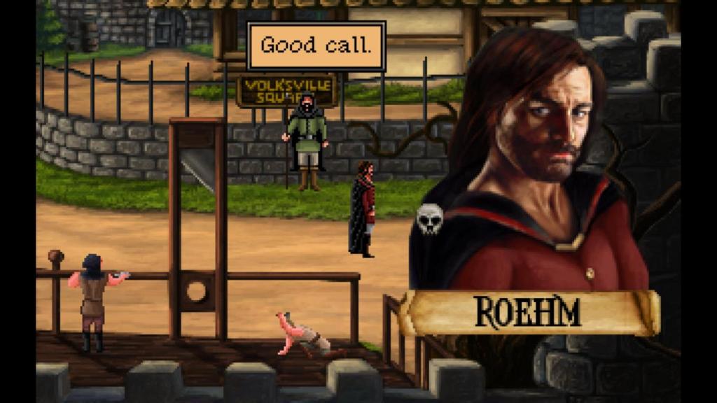„Quest for Infamy“, entwickelt von Infamous Quests und auf Konsolen portiert von Ratalaika Games ist eine absolute Liebeserklärung an die Reihe von Sierra durch und durch. Das fängt schon bei Namen an, wo man „Glory“ einfach durch „Infamy“ getauscht hat, was sowohl zur Identifikation mit der Vorlage, aber auch Anhebung dienen soll, denn wo sich die Quest for Glory-Spiele stellenweise zu ernst nahmen, mischt Infamy das Feld mit selbstreferenziellem Humor und vielen Anspielungen an die Vorlage auf, ohne dabei nur ein Klon zu sein. So entschied man sich für einen Artstyle der nah an der Sierra-VGA-Ära angelehnt ist und erzählt die Geschichte von Roahm, in sich selbst auch ein Wortspiel von denen es viele im Spiel gibt, der im Grunde nichts Gutes vorhat. Entgegen der Vorlage will er keinesfalls ein Held werden und strebt auch nicht nach Ruhm, sondern er ist sich selbst der nächste. So verschlägt es ihn auf der Flucht vor einem Baron mit dessen Tochter er etwas angefangen hatte in die Stadt Volksville, im Königreich Lonaria. Durch eine ungünstige Verkettung von Ereignissen hat Roahm keine andere Wahl, als sich auf die Suche nach einem mächtigen Juwel zu machen. Er wird allerdings nicht ausgewählt, da er besonders heldenhaft ist, sondern weil er einfach keine Skrupel hat und eher als Dreckskerl angesehen wird, dem jedes Mittel recht ist…