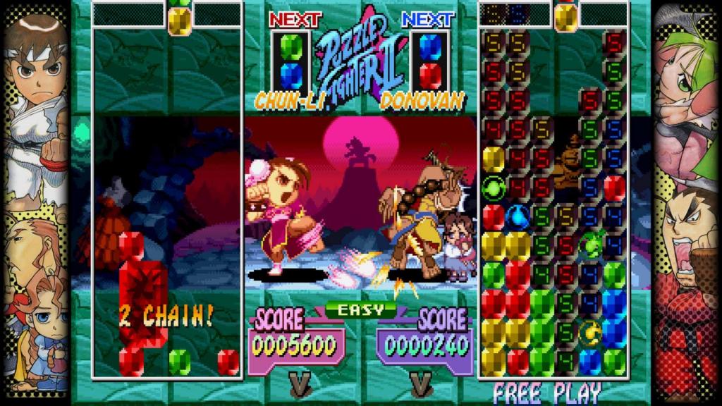 Der Rest des Line-ups ist zwar in dieser Beziehung traditioneller, aber nicht weniger gelungen. Bei den fünf Spielen aus der Darkstalkers-Reihe bedient man sich Elementen des klassischen Horrors, ähnlich wie es „Omen of Sorrow“ nachgebaut hat und die Teile lassen dabei eine ähnliche Weiterentwicklung und systematischer Verbesserung, wie die gefühlten hundert unterschiedlichen Teile von „Street Fighter II“ getan haben. Und wenn man gerade bei Capcom’s Vorzeigereihe ist, davon sind natürlich auch Spiele enthalten, die dabei aber mehr Abwechslung bieten, als man es von der Reihe eigentlich kennt. Denn neben dem klassischen Prügler „Hyper Street Fighter II: The Anniversary Edition“, ist das Puyo Puyo-artige Puzzlespiel „Super Puzzle Fighter II Turbo“ und „Super Gem Fighter Mini Mix“, quasi eine Chibi-Version der Vorlage, die auch ihre eigenen Qualitäten hat.