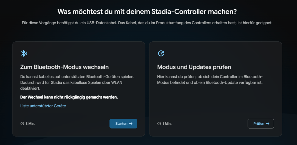 Allerdings zeigt Google wahre Größe und bietet allen Besitzern der Controller kostenfrei die Möglichkeit diesen per Firmware-Update auf Bluetooth umzuschalten, sodass man ihn wie jeden anderen Bluetooth-Controller, beispielsweise am PC verwenden kann. Wichtig sind dabei allerdings zwei Dinge: