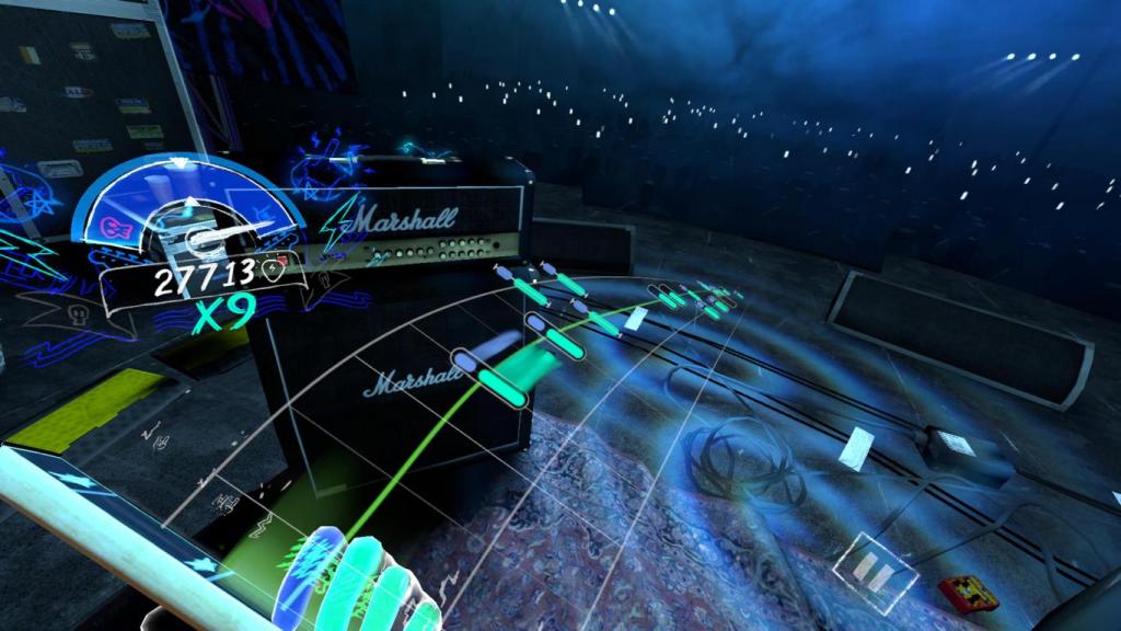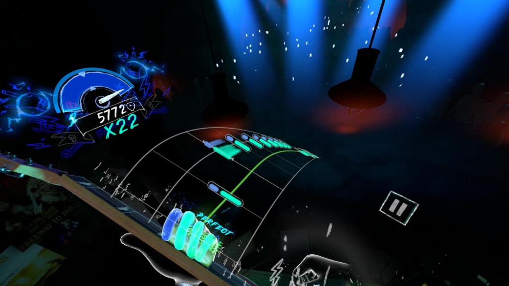 Die Locations sind zwar allesamt ziemlich dunkel und werden nur durch spärliche Beleuchtung und Handydisplays in der Menge erhellt, wirken aber gerade aus diesem Grund ziemlich realistisch und besonders das Gefühl zum ersten Mal in der großen Arena zu stehen war echt ziemlich beeindruckend. Allerdings sehen wir während dem Spielen nicht besonders viel davon, denn wir müssen immerhin eine Performance abliefern. Dazu blicken wir größtenteils nach unten zum Gitarrenhals, wo im Takt der Musik Noten gespielt werden müssen. In bester Guitar Hero-Manier schalten wir bei Ketten von fehlerfreien Eingaben diverse Multiplier frei, die unsere Punkte in die Höhe schnellen lassen. Eine fehlerhafte Eingabe hingegen nullt den Multiplier, liefert einen akustischen Fehler in der Musikabfolge und führt mitunter auch zum Game Over, wenn wir zu viele Fehler machen.