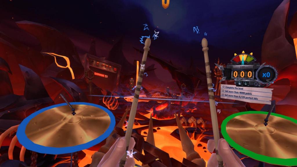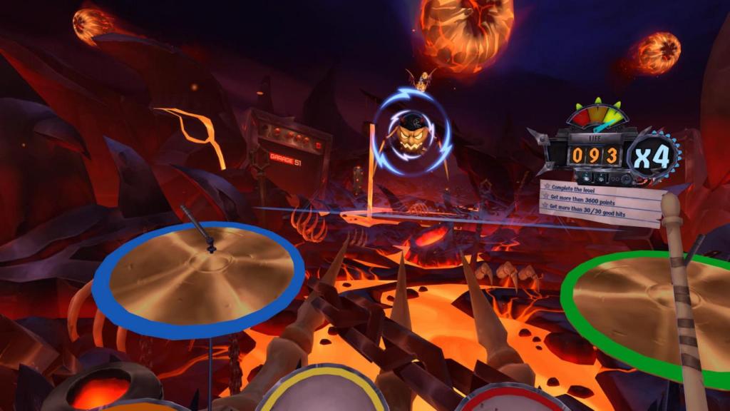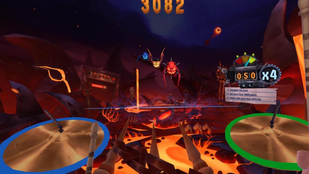 Je nach Körpergröße und Vorliebe kann man die Position und Höhe der eigenen Elemente über das Menü jederzeit anpassen, wobei ich den Standard für mich persönlich passend fand. Entgegen in einem dunklen Club nur irgendwelche farbigen Noten auf uns zu fliegen zu sehen, sitzen wir leibhaftig in der Hölle, wie man sie von Plattencovern der 80er Jahre kennt. Die Noten fliegen in Form von kleinen Dämonen auf uns zu und wir müssen sie durch unsere Drums zurück in das Höllenloch schicken, aus dem sie gekommen sind. Neben diesen Standardgegnern gibt es sogar ein paar Bosse, die das Spielprinzip auflockern.
