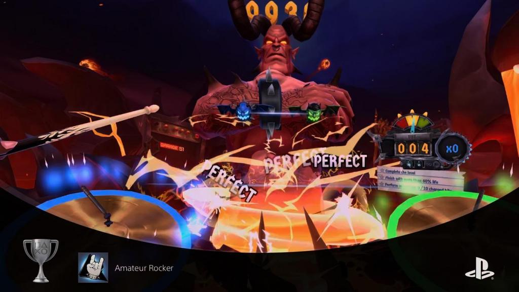 Auch wenn das Spielprinzip dabei schon fast ein wenig kindlich klingen mag, so ist es gleichzeitig unterhaltsam und überraschend fordernd, denn selbst auf dem leichten Schwierigkeitsgrad muss man das komplette Schlagzeug bespielen und wie beim echten Schlagzeug müssen die Hände teilweise gegeneinander arbeiten. Aber immerhin muss man sich nicht noch zusätzlich mit den Füßen beschäftigen, denn die TomToms wurden insoweit optimiert, dass sie die Base Drum implementiert haben. Und wer das schon überraschend findet, der wird noch mehr überrascht sein, dass es sich beim Spielen wirklich anfühlt als ob man mit Drumsticks auf ein physisches Drumset einschlägt. Man spürt über die Sense-Controller wirklich einen Widerstand und Druckwellen landen sogar im Headset. Allein für das Gefühl lohnt es sich mal in die Demo rein zuschauen, die es kostenlos im PSN gibt.