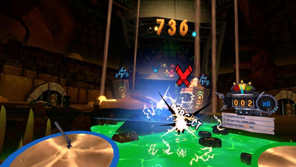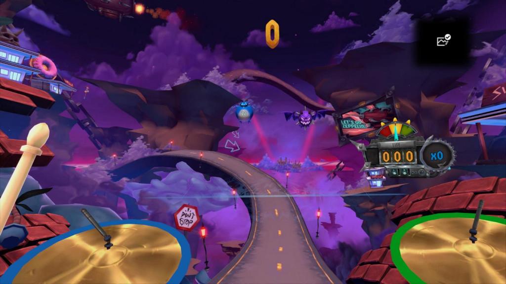 Interessanterweise schalten wir neue Episoden nicht über das simple Absolvieren von Songs frei, sondern müssen zusätzlich Sterne verdienen, die an bestimmte Kriterien, wie fehlerfreie Eingaben, Punkte, etc. gekoppelt sind. Das Spielprinzip ist dabei so simpel, wie süchtig machend. Wir spielen sitzend, ein virtuelles Schlagzeug steht vor uns, sie Becken und TomToms sind über Farben kodiert und unser Ziel ist es die Drums zu einem Song zu spielen. Wir greifen mit den Sense-Controllern an unseren Rücken, wo sich ein unendlicher Vorrat an Drumsticks befindet, falls wir mal einen Stick verlieren, was schon mal passieren kann, da man die Sticks auch drehen und werfen kann.