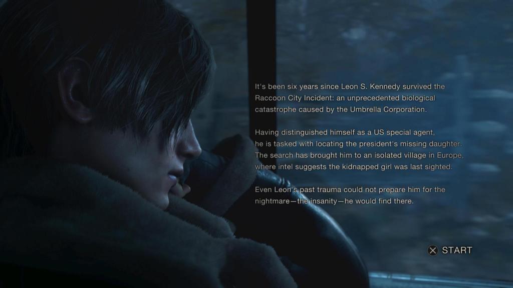 Die Demo beginnt mit einer kurzen Cutscene, die wahrscheinlich auch dieser Anfang des Spiels sein wird, zumindest wenn man vom Original ausgeht. Leon S. Kennedy erzählt uns von den Ereignissen aus dem zweiten Teil, in der er ebenfalls der Protagonist war. Nachdem er an seinem ersten Tag als Polizist einem tödlichen Zombieausbruch und der Zerstörung von Raccoon City bewohnte, wurde er für eine Spezialeinheit, die direkt dem Präsident unterstellt ist, zwangsrekrutiert. Dann gibt es einen Zeitsprung und eine Texttafel zur Einordnung, wahrscheinlich fehlt an dieser Stelle eine neue Szene des Remakes, und wir starten mit Leon in einem abgelegenen Waldstück.