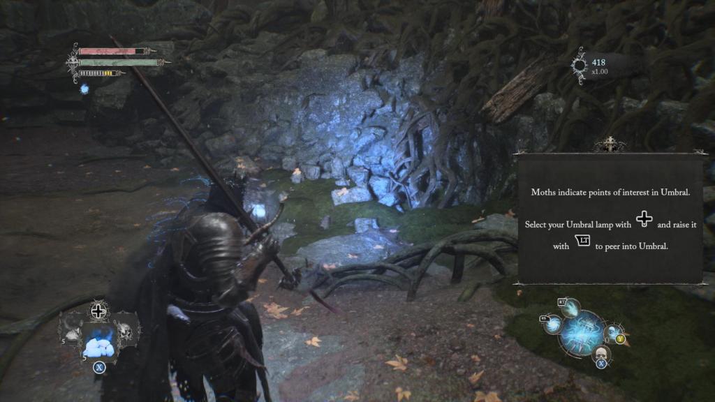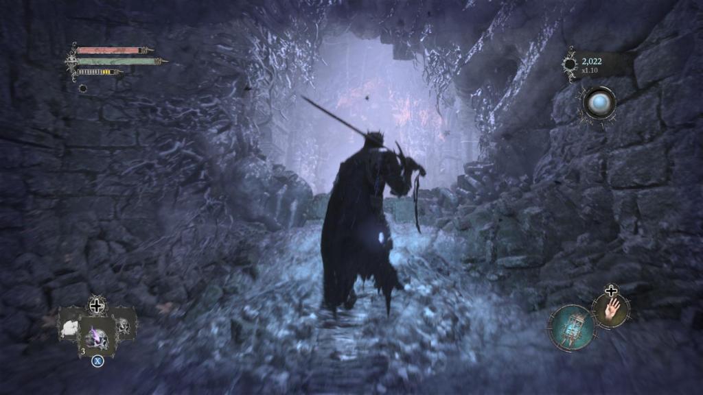 Da Spiel erlaubt uns zwar jederzeit per Tastendruck einen Blick in die andere Welt, aber der Wechsel ist nur an vordefinierten Punkten möglich, was etwas nervig sein kann, wenn man zwar weiß was zu tun ist, man aber erst nach einem Übergangspunkt suchen muss. Die Spielwelt ist zwar nicht übermäßig groß, man kann sich aber trotzdem verlaufen und läuft dann auch gleichzeitig Gefahr auf dem Weg das zeitliche zu segnen. Als lebende Leiche respawnen wir zwar wieder, aber entsprechend anderer Soulslikes müssen wir dann unsere Habseligkeiten am Ort des Todes wieder einsammeln, wenn wir uns nicht dauerhaft davon verabschieden möchten. Die zwei Welten fungieren dabei auch als zweite Chance, denn sterben wir im Axiom, können wir es im Umbral direkt nochmal versuchen, ohne Game Over und Respawnen, ein insgesamt wirklich netter Twist.