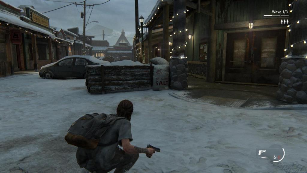 Spielerisch bleibt das Spiel dabei dem Erstling größtenteils treu. Wir steuern Ellie in gewohnter Weise aus der 3rd-Person-Ansicht, wobei das Geschehen beim Verwenden von Schusswaffen etwas heranzoomt und uns über die Schulter blicken lässt. Im Vergleich zu Joel ist Ellie aber um einiges agiler. Sie kann den Gegnern aktiv ausweichen, kann sich sogar komplett auf den Boden legen und so sogar unter Autos Schutz suchen und kann Springen. Das war im Vorgänger nur an spielerisch-relevanten Punkten durch die Aktionstaste möglich und nun hat sie einen eigenen Sprungknopf, der sogar für kleinere Plattformer-Passagen genutzt wird, die zwar nicht mit Uncharted vergleichbar sind, aber dennoch eine willkommene Erweiterung darstellen.
