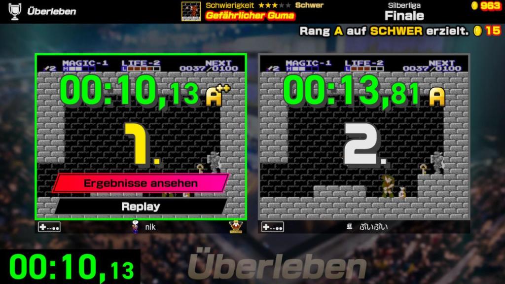 Insgesamt hatte ich, trotz der kleineren Kritikpunkte, immens viel Spaß mit der Sammlung und kämpfe auch nachdem ich alle Herausforderungen beendet habe, mit der persönlichen Bestzeit. Denn mir war es bisher leider nur einmal möglich die Bestnote, den S-Rang, in einer Herausforderung abzustauben und das kratzt als alter NES-Veteran doch etwas an mir… Die „Nintendo World Championships NES Edition“ ist in meinen Augen ein Muss für Retro-Gaming-Fans und bietet eine spannende Mischung aus Nostalgie und Herausforderung. Die verschiedenen Spielmodi sorgen für Abwechslung und der Party-Modus ist perfekt für gesellige Abende. Wer die klassischen NES-Spiele liebt und sich gerne in Speedruns misst, wird hier voll auf seine Kosten kommen. Es ist eine wunderbare Hommage an eine legendäre Ära des Gamings. Ich wünsche mir persönlich noch mehr Inhalte, sowie eine SNES-Variante, die ausgehehend von der Betitelung des Spiels als „NES Edition“ mit Sicherheit irgendwann kommen wird!